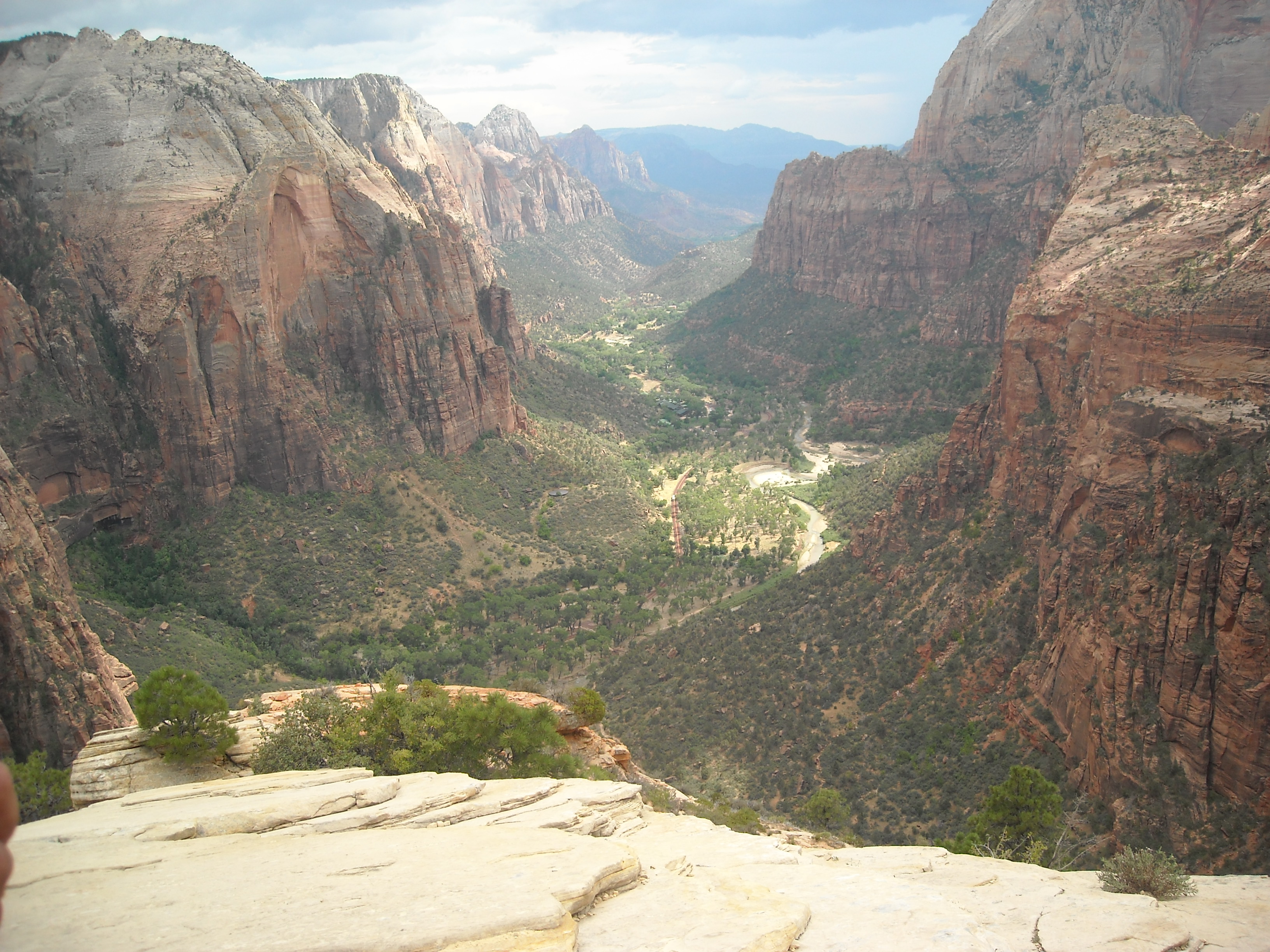 It was mid-afternoon when we got to hiking the switchbacks. We didn’t waste time ascending these which was a good thing, because as we got to the spur trail to Angel’s Landing, we realized there was a thunderstorm moving in. Erik was very determined to make it to the end, and so we quickened our pace, even as we moved along the dangerously exposed sections of trail.