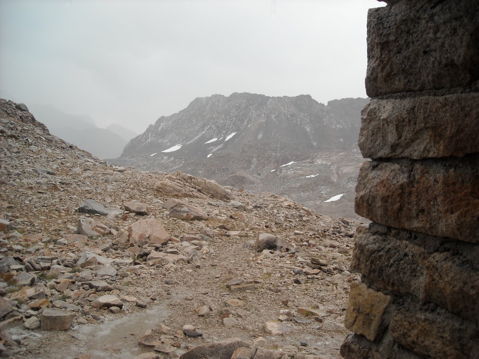Eventually it was getting very wet inside the cramped hut and we obviously couldn’t all spend the night there and we didn’t know how much longer it might rain so we, too, shoved off. There was hail on the ground and distant mountains and so many puddles on the trail that soon our shoes were soaked through and we were damp under our rain gear. The valley walls we covered in small waterfalls.