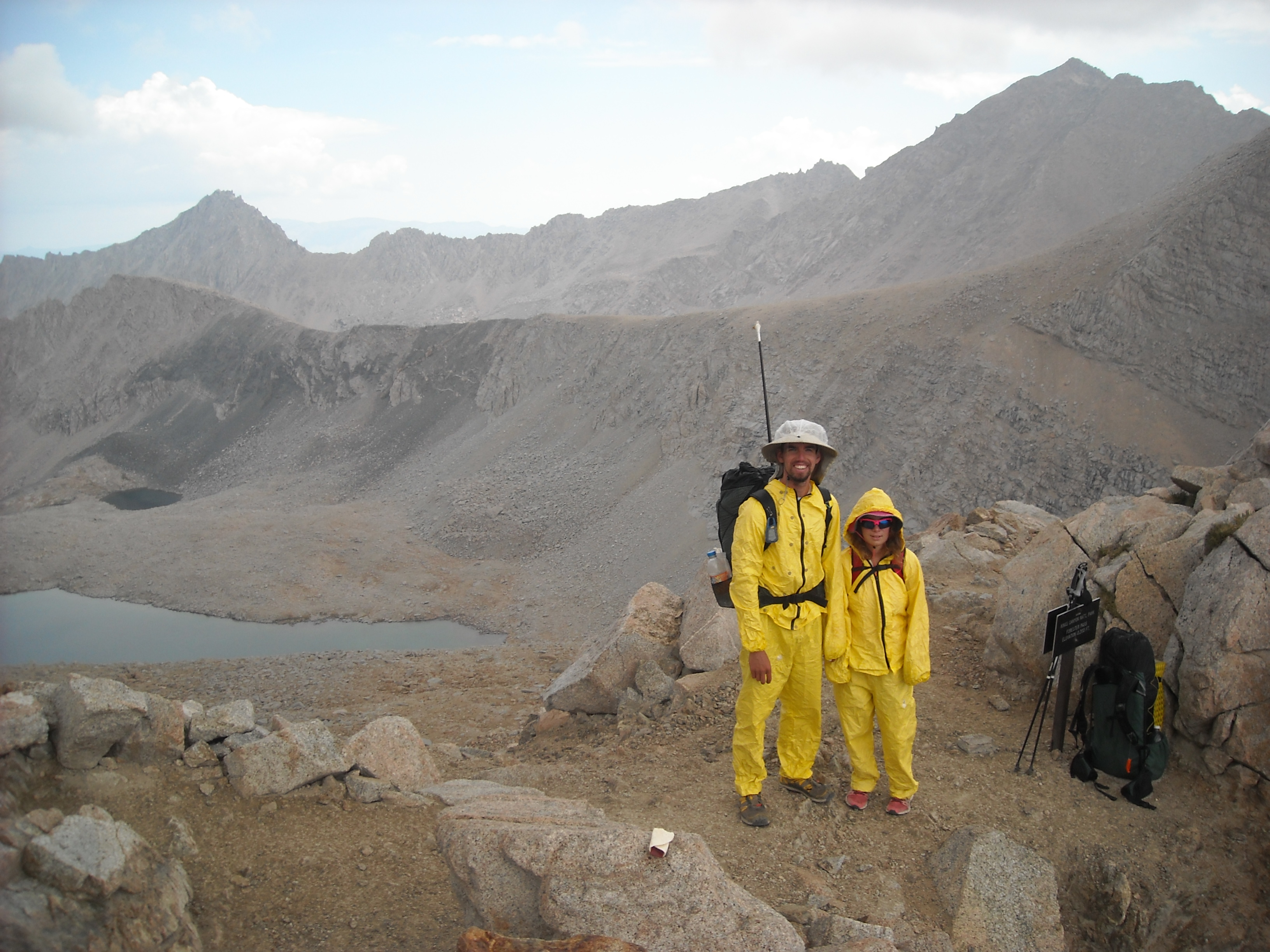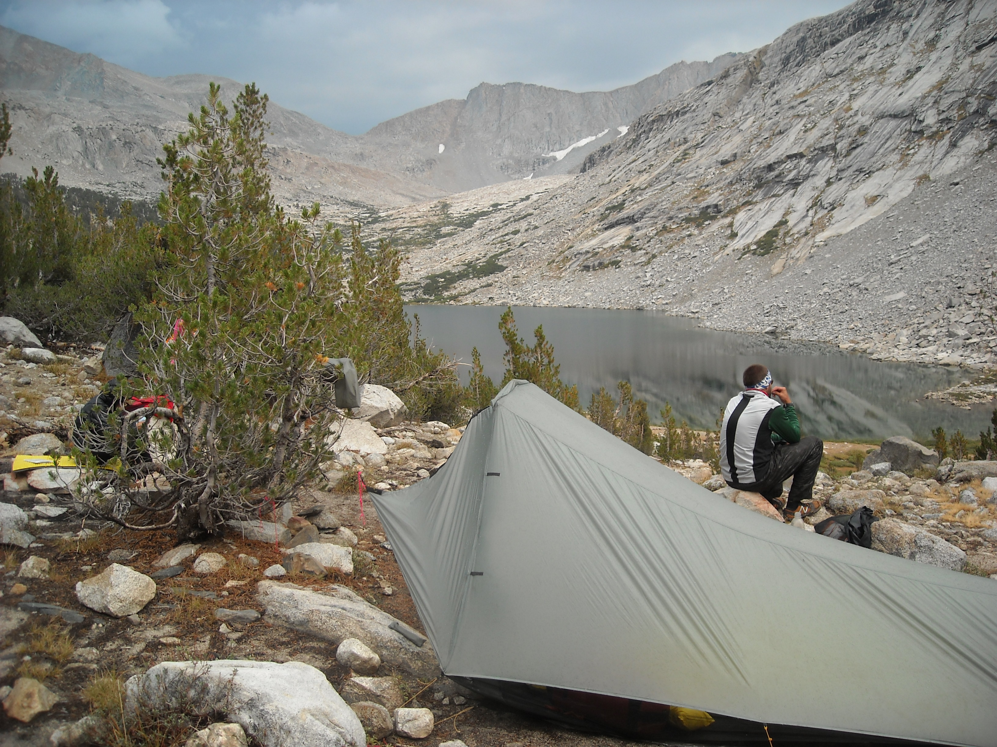 Erik proposed we hitchhike back up to the Onion Valley Trailhead but I preferred to pay for a ride from the hotel. Even though I’m cheap, I guess I thought it was worth it rather than trying to hitchhike. It got us up there early and in good time but as we climbed back to Kearsarge Pass, the clouds rolled in and I didn’t want to chance it so got out my rainsuit and played the raingear games. I got hot in that suit and no precip fell and then I took it off and it began to sprinkle and on and on and on.