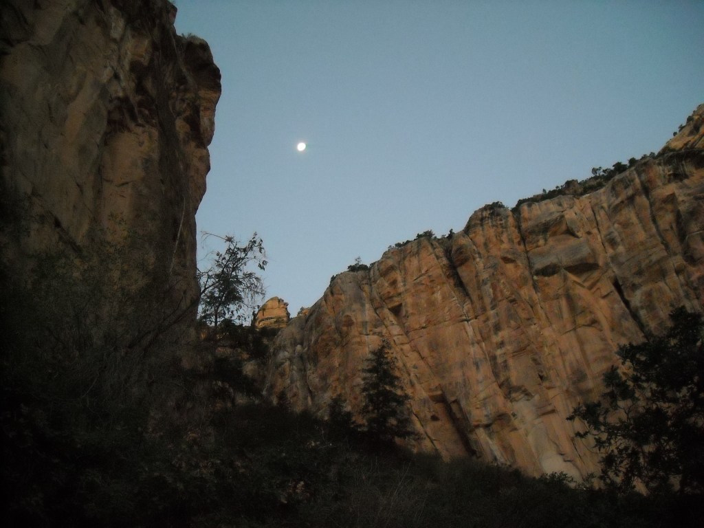 We began our South Rim to North Rim hike just before 6 am in the total darkness. Here’s the moon as we descended the upper layer of the canyon.
