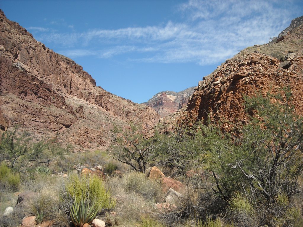 After crossing the Colorado River we passed by the Bright Angel Campground and then began hiking up Bright Angel Canyon next to Bright Angel Creek. You can see a pipe in the creek which they use to divert water down to irrigate the campground to provide more greenery and shade.Hiking out of the shade on the North Kaibab Trail. I was definitely taking in all the desert plants but also noting how high we still had to climb!
