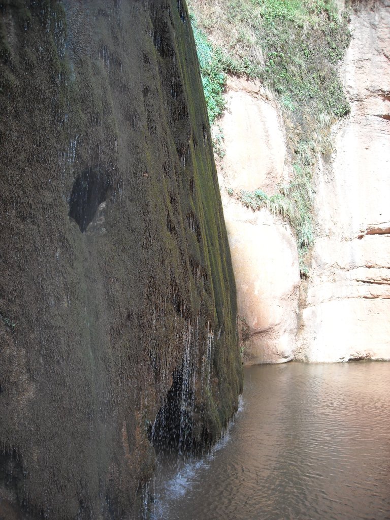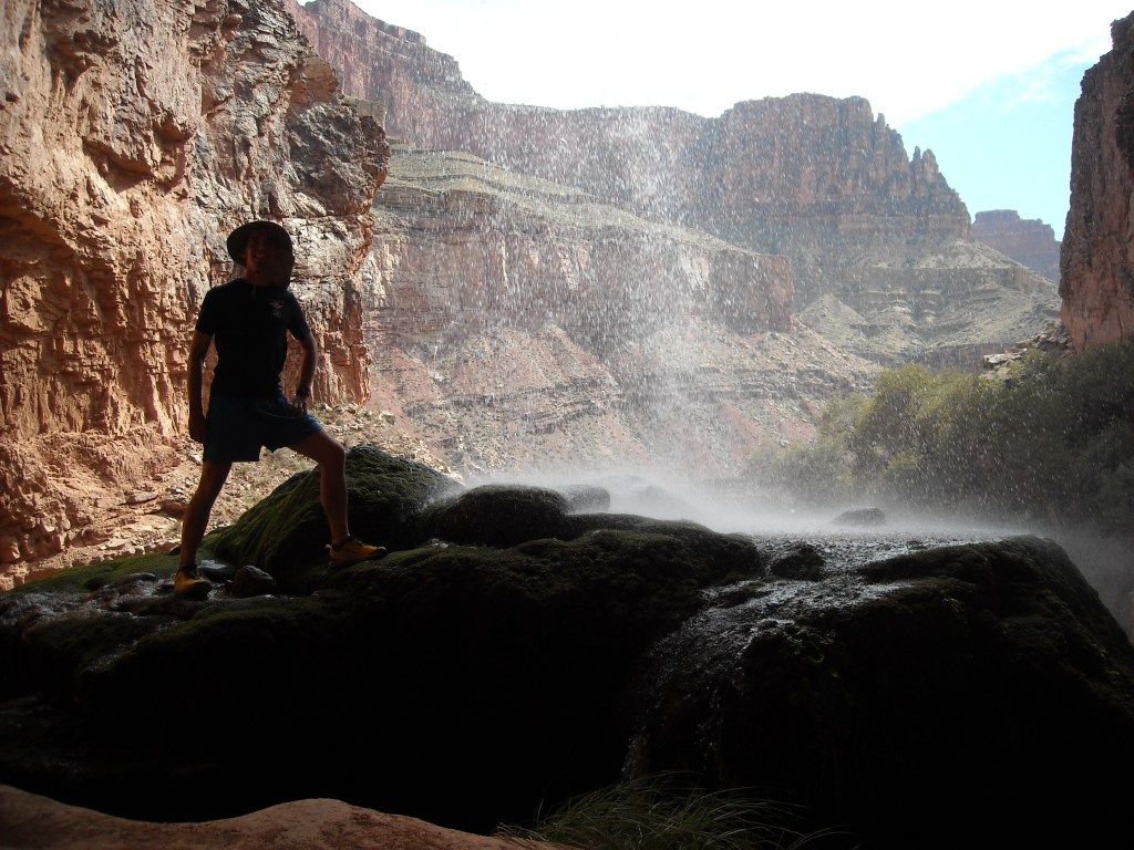 Erik wanted to get as close as he could to the spray. Me chilling behind the waterfall.