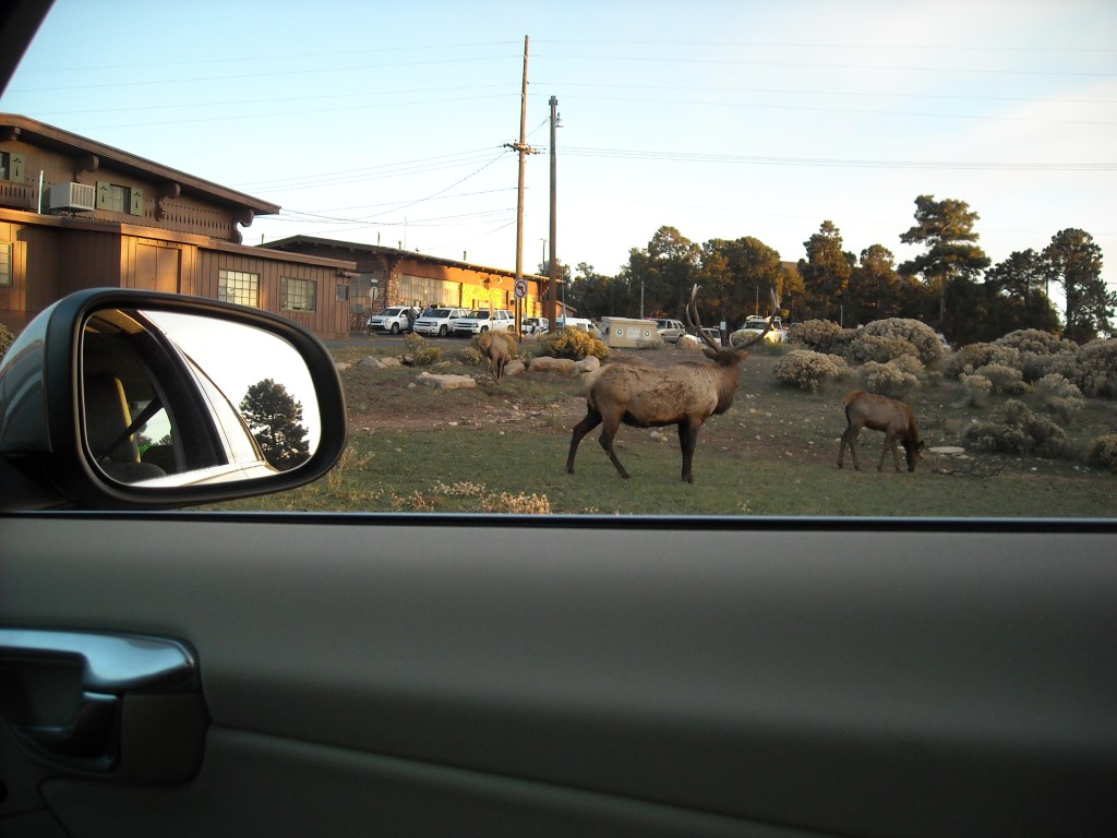 We then proceeded to walk an additional mile along the edge of the canyon back to our rental car. Erik made me climb over the rock barrier to take this picture. It does show a good view of our small packs and our trusty water bladder (i.e. boxed wine bag).And because no visit to a National Park is complete without seeing wildlife at close range from the car…