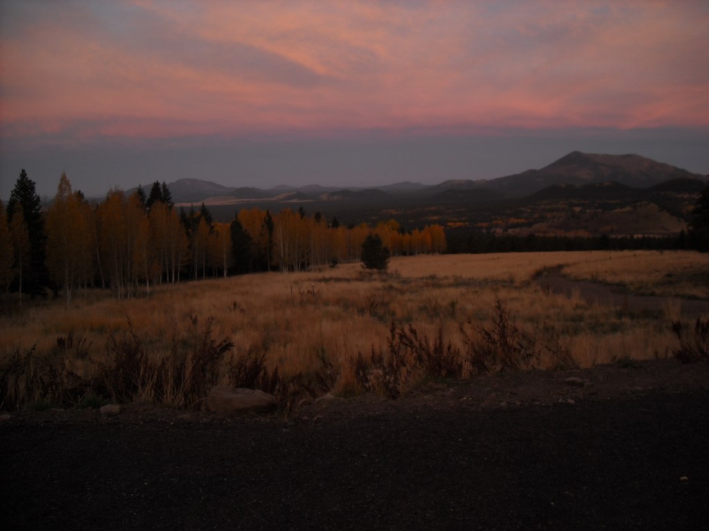 Our hike took a bit longer than we had hoped and it was already getting dark as we drove out of the South entrance. Such is life. After dinner at the McDonald’s in Tusayan, we drove south and then southeast to try to find a National Forest Campground near Humphreys Peak (specifically the Freidlein Prairie Dispersed Camping area on Fire Road 522). Unfortunately we found the road quite rough for our rented sedan and after the first couple sites were full, we abandoned and went to Plan B which was camping at the trailhead which shares a parking lot with the Arizona Snowbowl Downhill Ski Area. We tried to find a spot to pitch our tent in the trees but there really wasn’t one and there was some ruckus going on at the restaurant and hence we didn’t sleep very well.