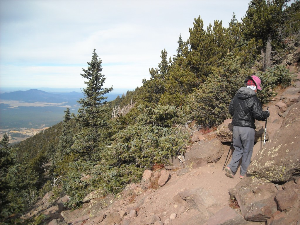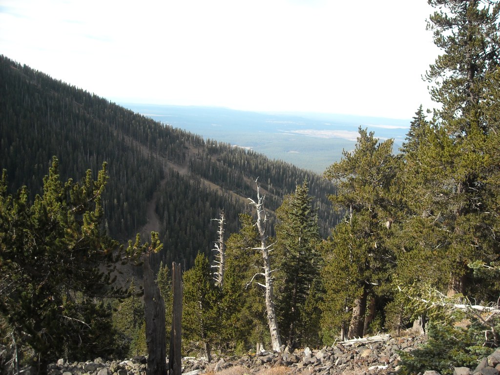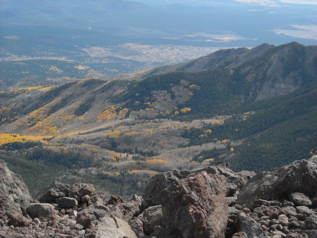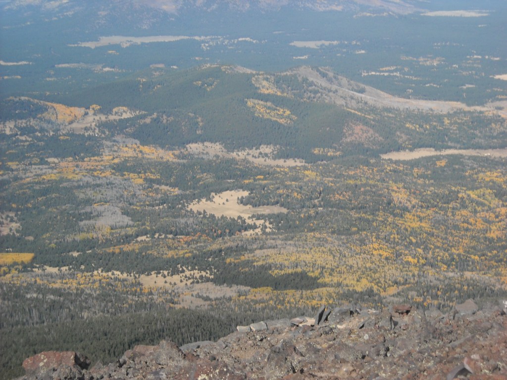 The yellow aspen forest.Pretty pockets of aspen trees.Looking north to the Grand Canyon. We kinda did the two mile vertical challenge from the Colorado River to the top of Mount Humphreys in less than 24 hours.Hiking the open section on the last switchback.Looking back up to Mount Humphreys (tallest peak on the left) from the trailhead at Snowbowl Downhill Ski Area (they do get snow in Arizona!).