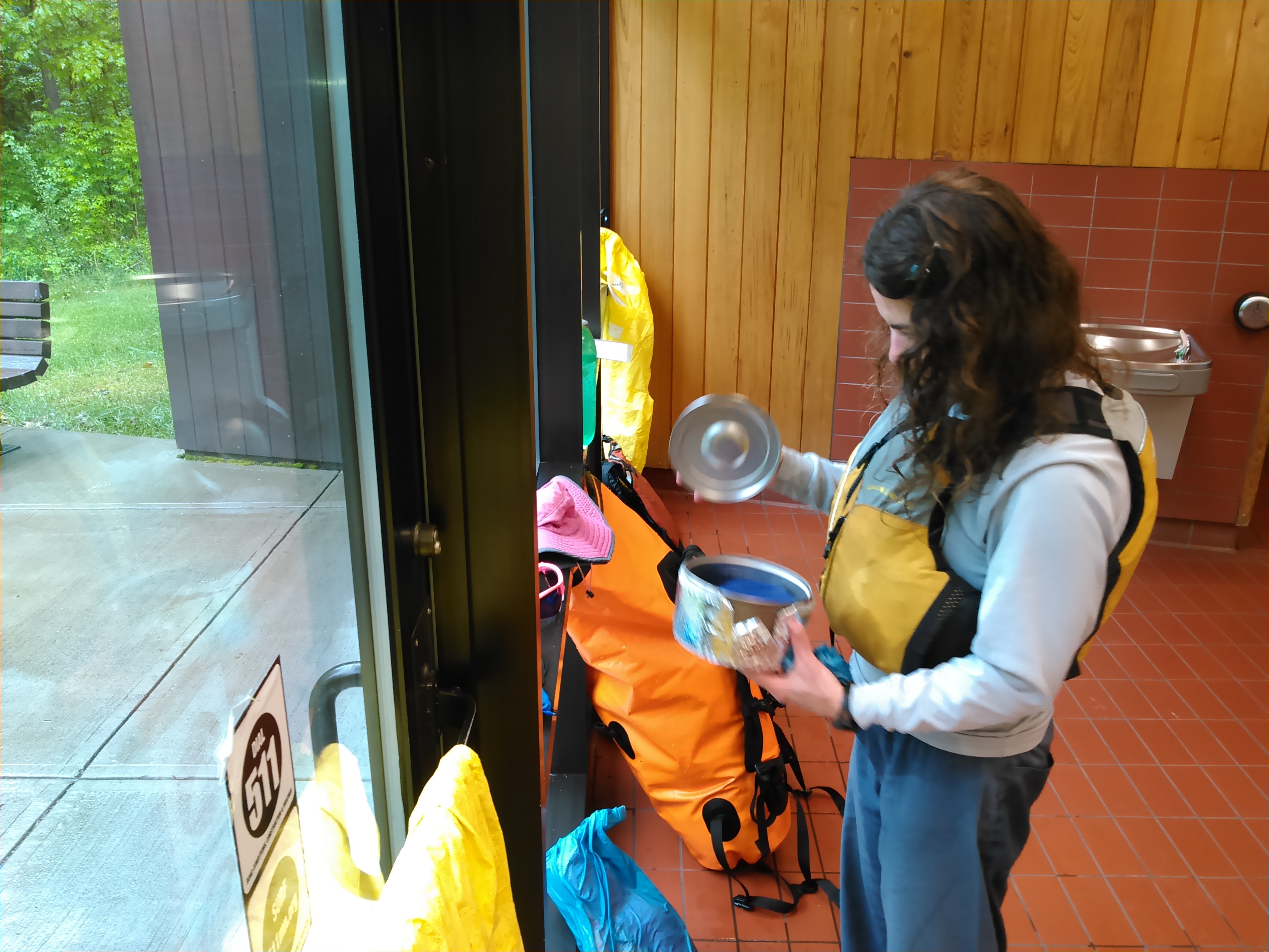 During this stretch of river my mood was quite somber. The map noted a rest area and nearby water campsite called “Long Day” ahead and I thought about staying in the rest area for a bit and getting dry. I had some vague memories of a nice building from my childhood. When we finally got to this rest area there was a muddy trail leading up the bank. I went exploring and was quite happy when I found it. We stayed there for 3 hours, cooking our hot meal for the day and drying out under the hand dryers.