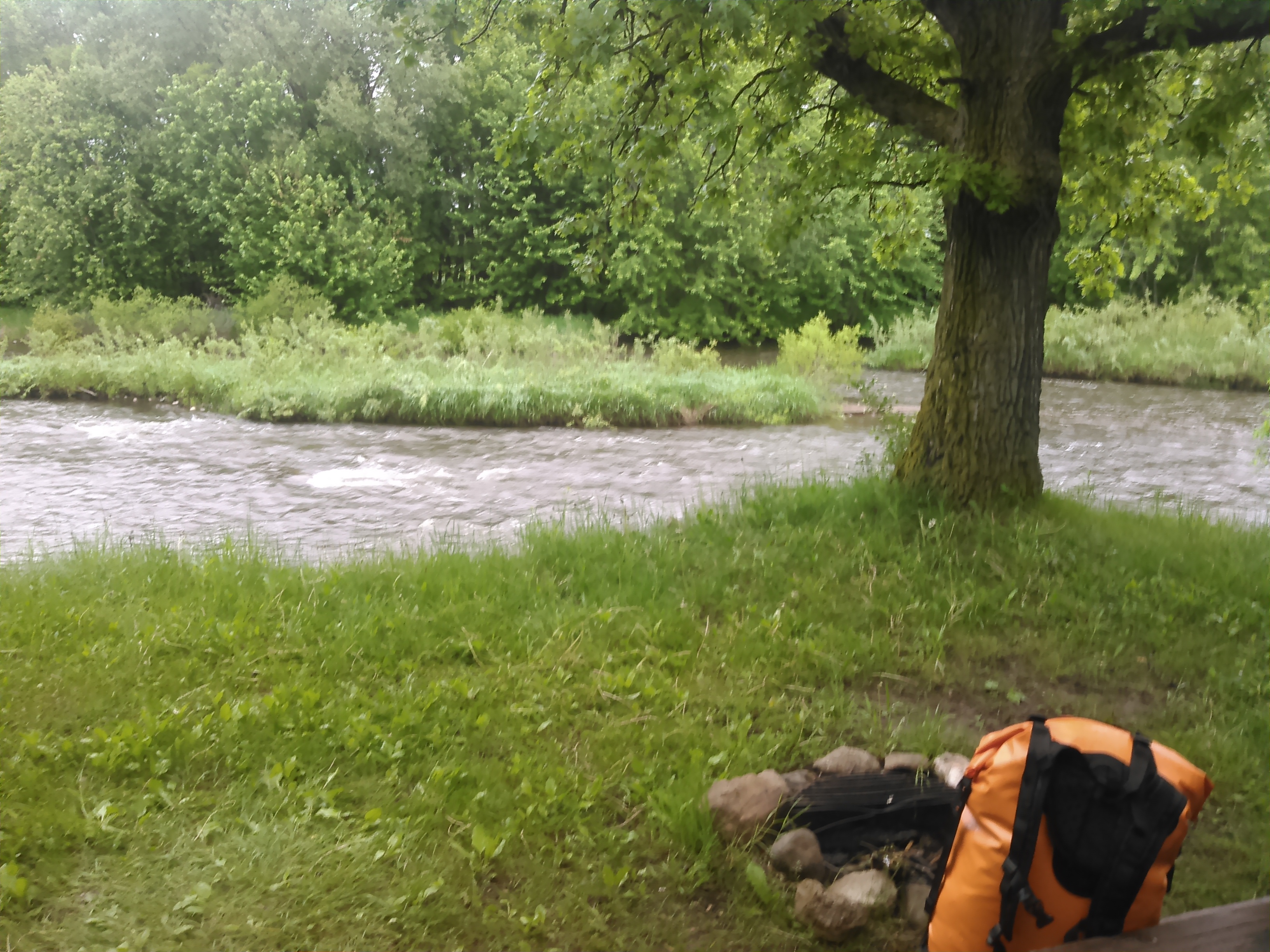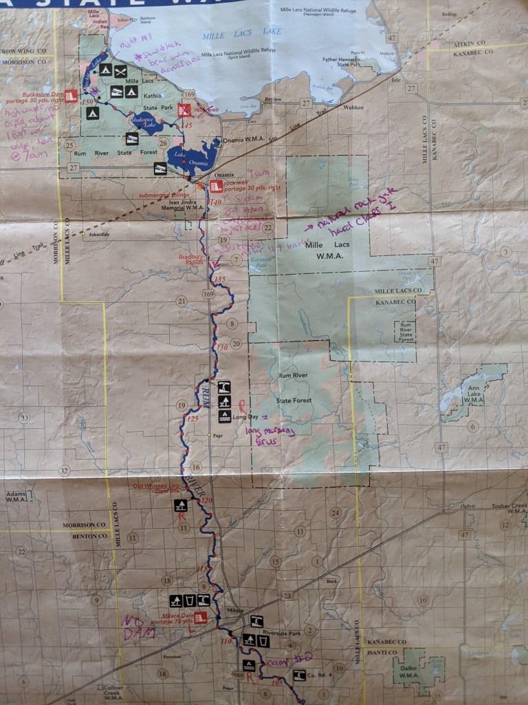 When we were finally dry and warm and it had mostly stopped raining for the day, we left the rest area in better spirits and continued our paddle. There was no evidence of the Old Whitney dam at mile 122 and somewhat surprisingly as well, the Milaca dam (we suspect this dam was removed at some point as it doesn’t show up on the new map but it did on our old one).