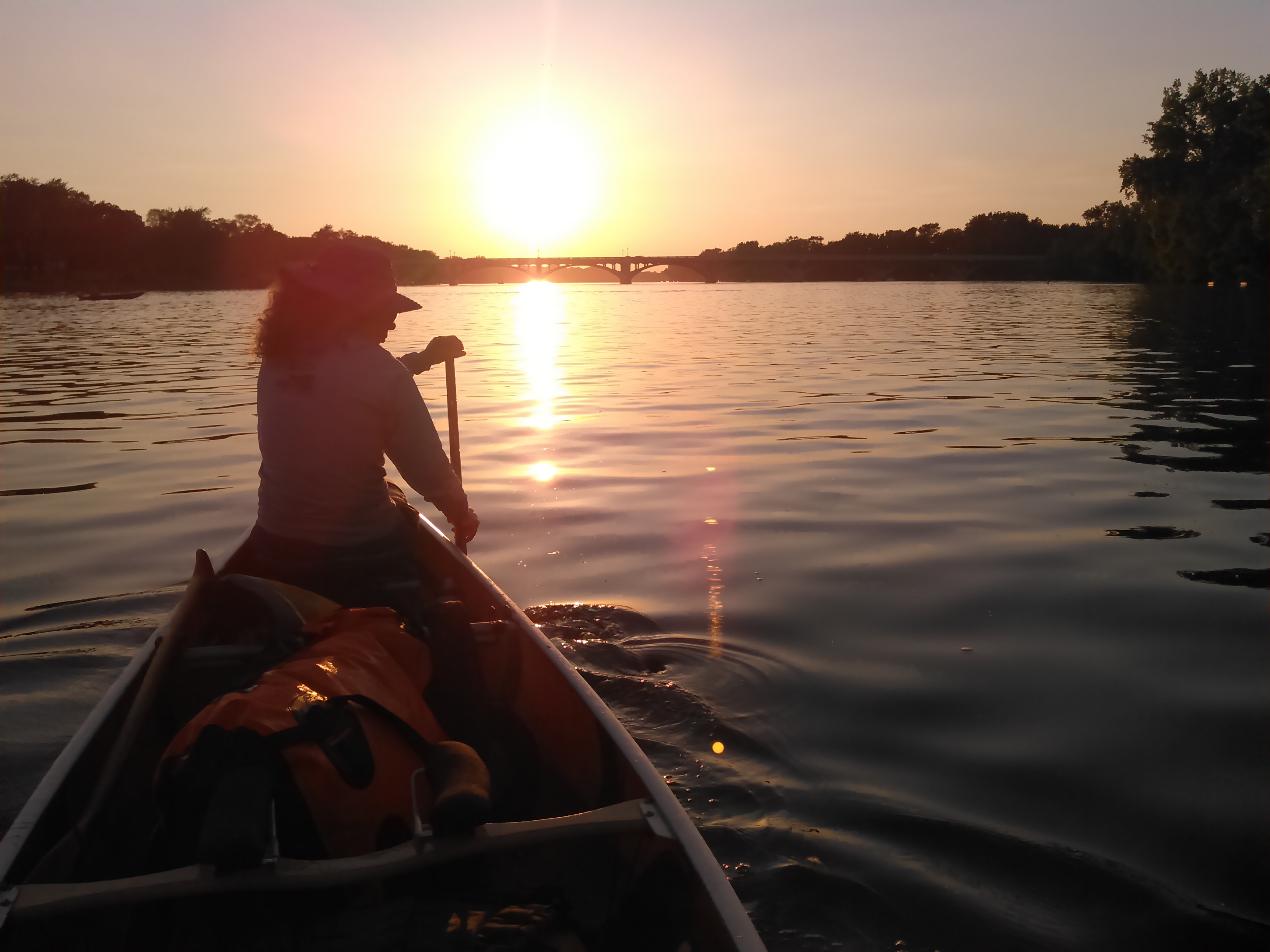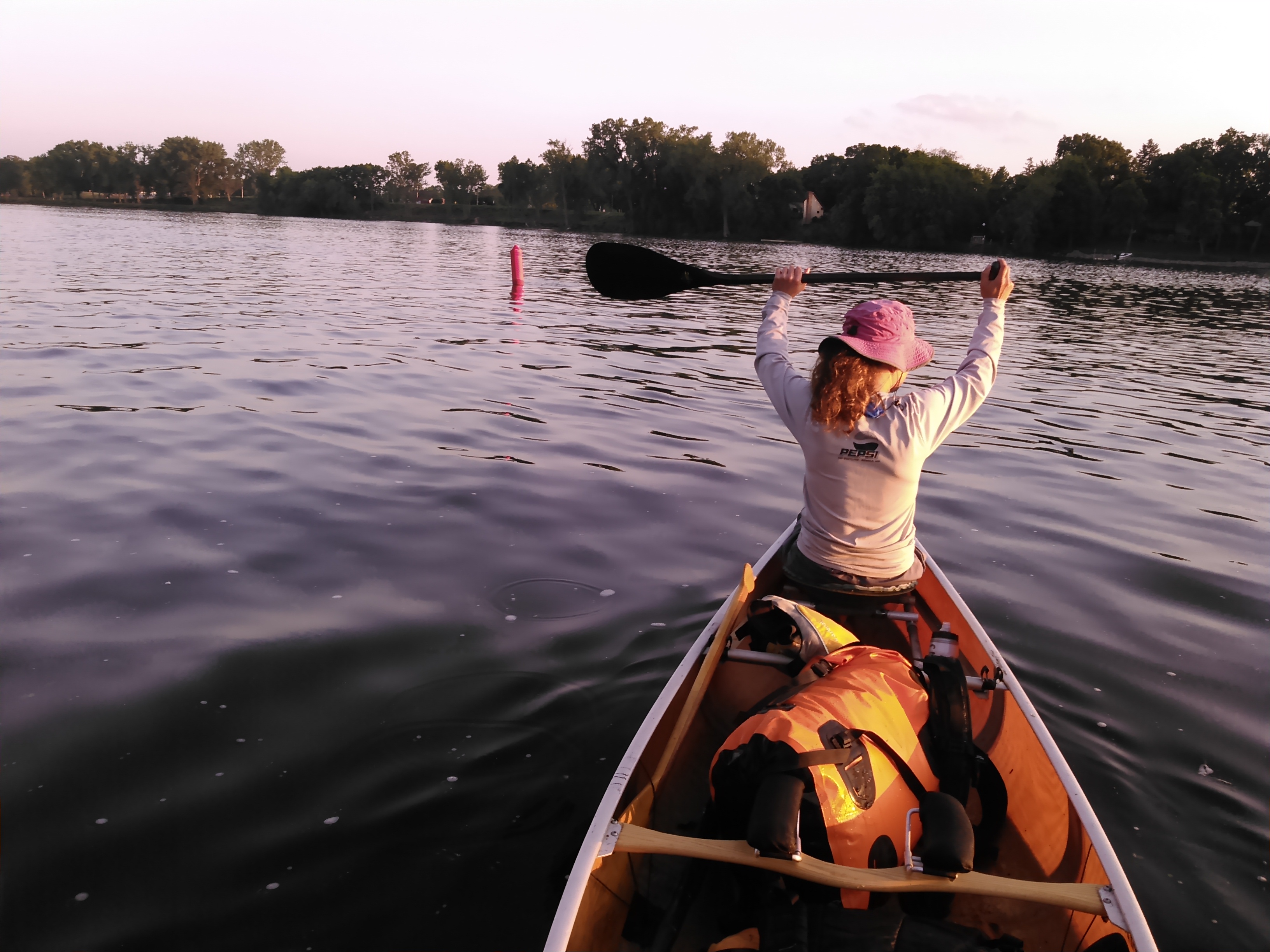 The next morning we awoke at 5:30 AM and we’re paddling by 6:40 AM after a short portage down to Lake Ogechie. We saw lots of trumpeter swans and pelicans before getting to the Buckmoore dam at the lake outlet which I remembered being quite scared of as a child. As we approached the dam we didn’t hear any rushing water and the only evidence of a dam were small concrete walls on either side of the river with signs marked dam. As we floated over the concrete dam, we could see it a foot below the surface.
