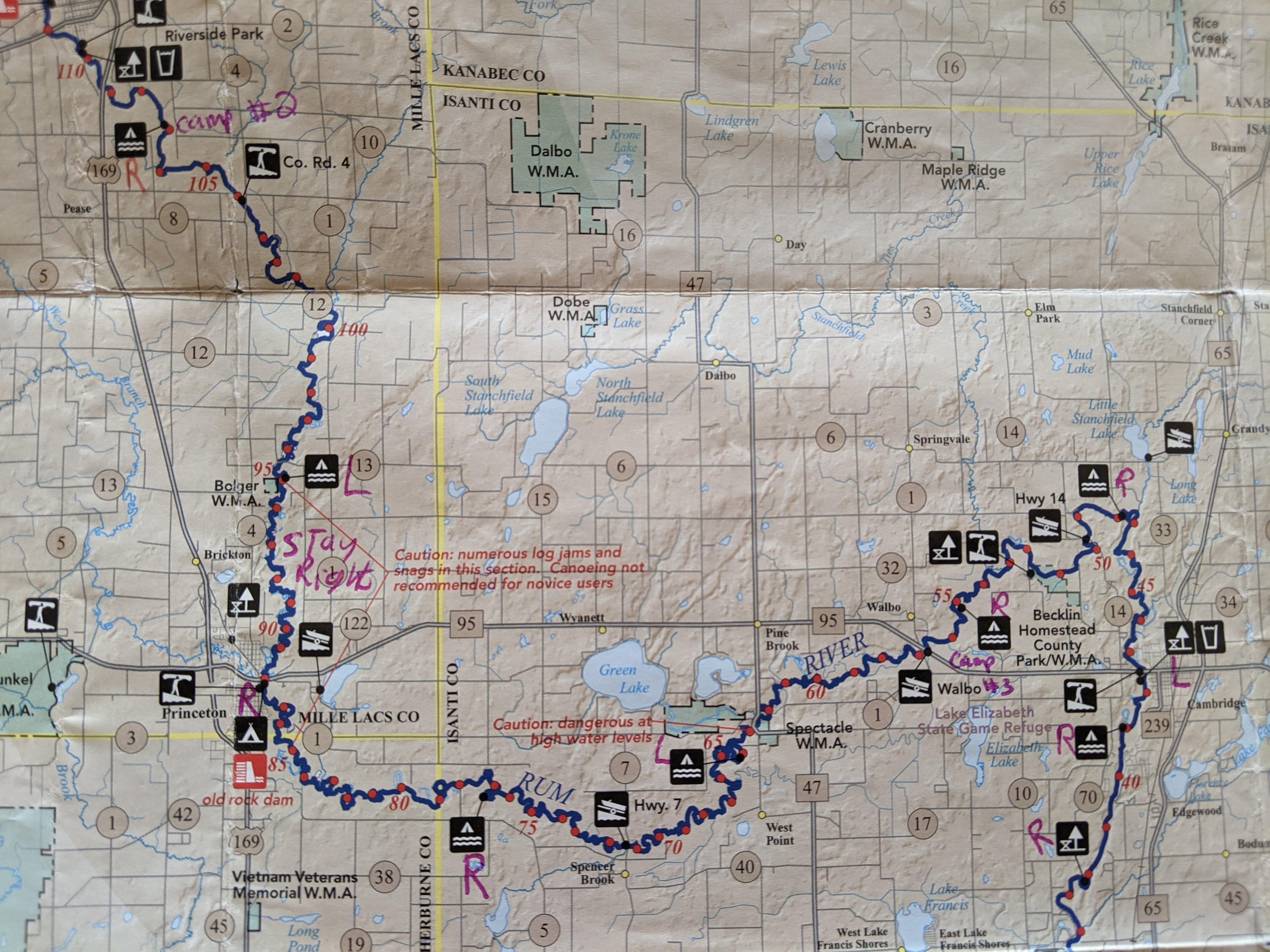 Water levels for our trip were 10.75 feet at Onamia (medium) and 3.3 feet at St. Francis. At this water level we glided over most of the rocks and even dams but given numerous rocks above mile 95, we would not recommend paddling at lower water levels. Obviously higher levels bring their own danger with stronger current.