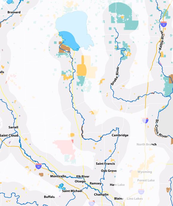 At St. Francis we took a break. Erik walked to the gas station and bought us some ice cream treats. Under the County Road 24 bridge in St. Francis there was a portage noted on our map and we found a Class I rapid under the bridge. Neither of these are marked on the new Map 3 of the Rum River. The river again got kind of rocky in this section but water levels were just high enough it wasn’t a problem.