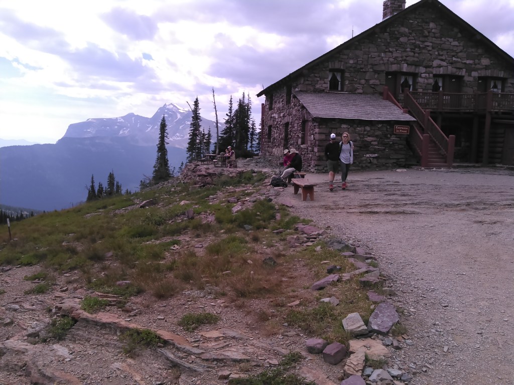After passing the bear, the sky gradually began to clear and we got better views. We wrapped around Lincoln Peak and when we got to the Sperry Chalet, Erik suggested we go in and get some hot water and eat our breakfast that we had been saving just for this chalet. Usually we eat our oatmeal cold in the morning so having hot oatmeal was a treat.