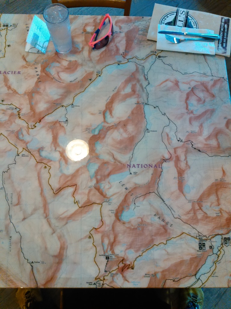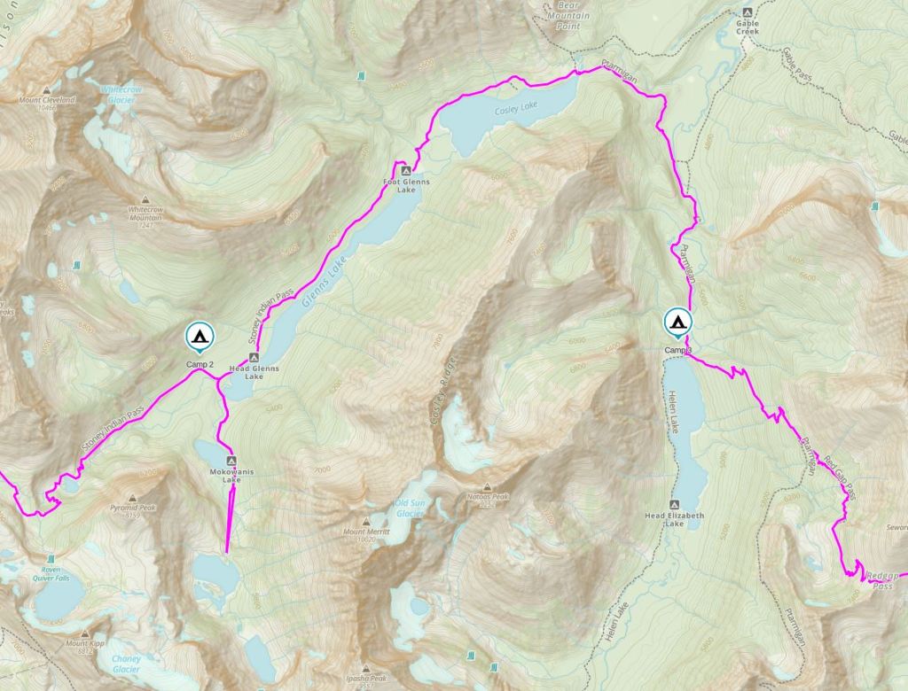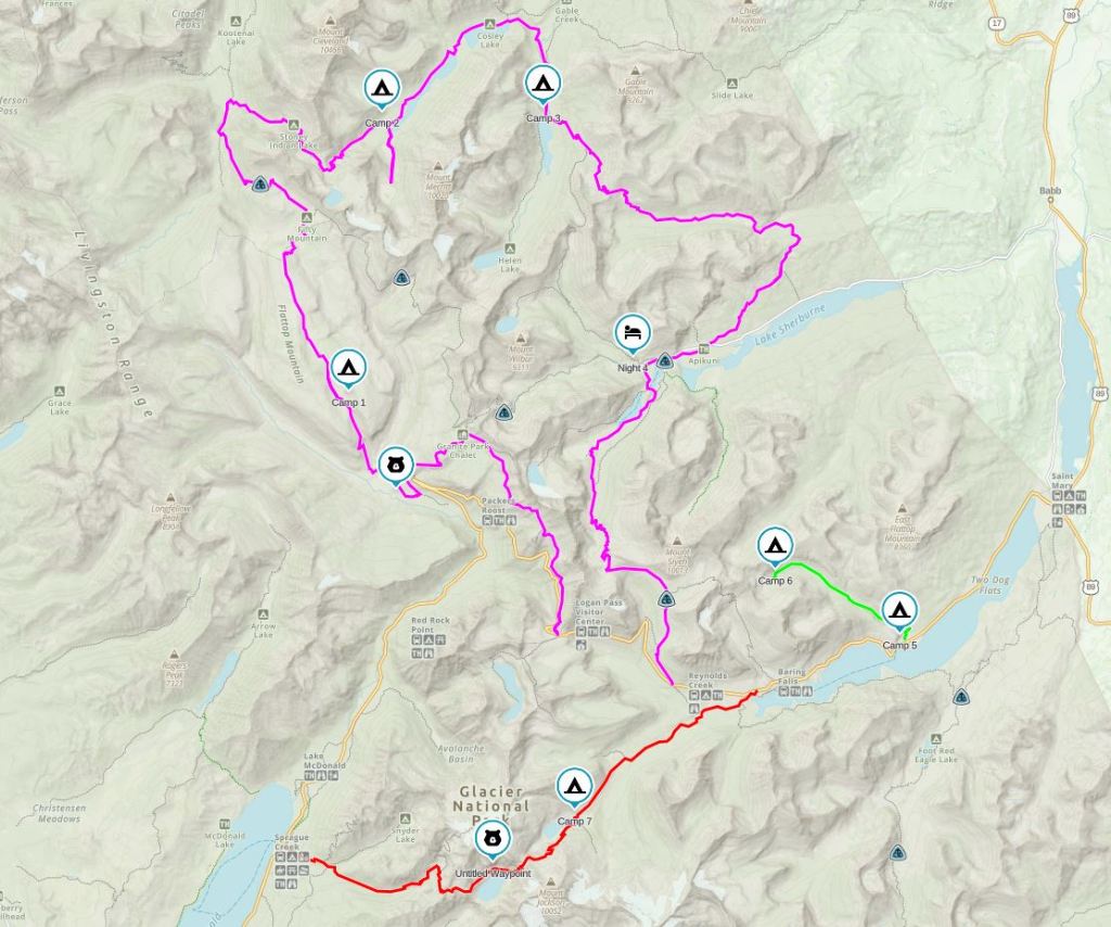 We poured over the map of Glacier National Park for months before deciding on a route. Then we applied for permits, hoping that our desired backcountry campgrounds would be open. We broke our trip into two sections, with a night in a hotel at Many Glacier, hence, we got the permit we wanted for the second (south) half of our trip, but not for the first (north) half. Glacier has a rule that permit applicants can’t travel more than 15 miles in one day. The only exception is that the day of, in person, they grant permits for farther.