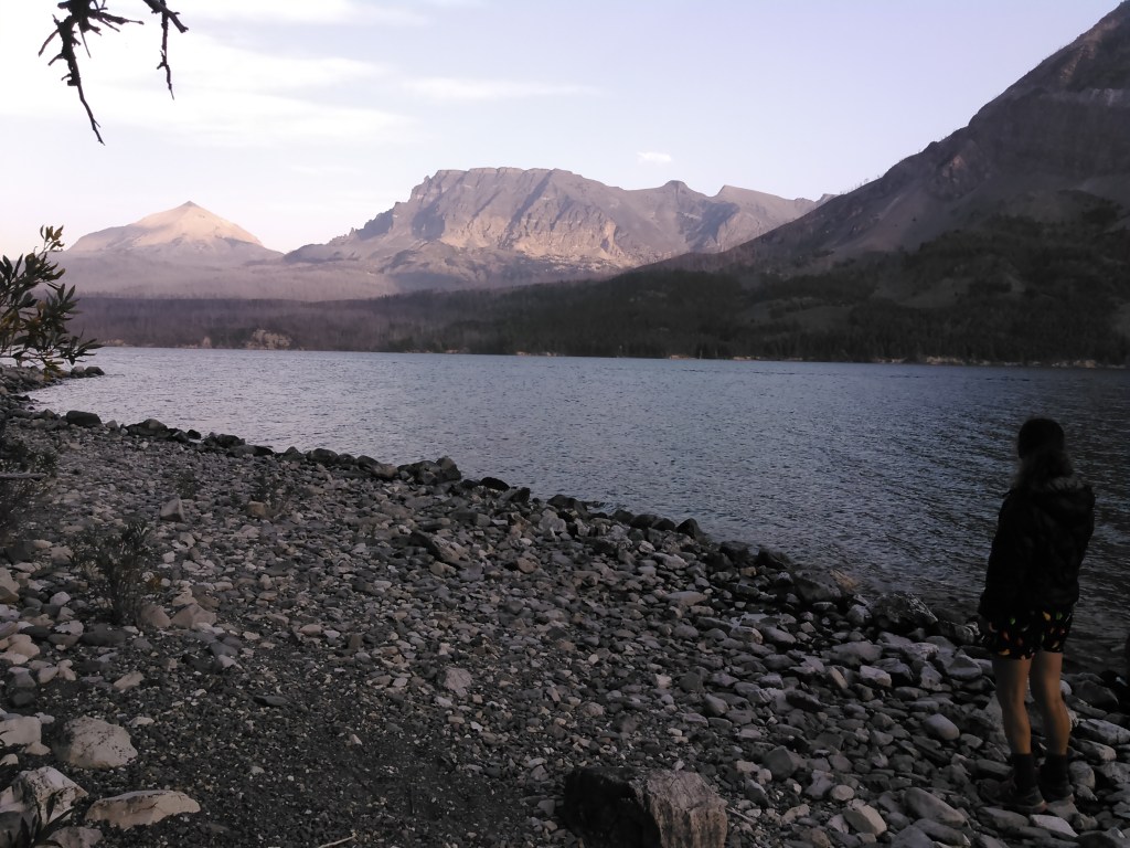 Once down to Going to the Sun Road, we took the park shuttle to the Rising Sun Campground where we stayed in a walk-in site. We met a chatty couple from Coeur d’Alene who were quite nice. I enjoyed the flush toilets at the campground. One of the downsides to the backcountry campgrounds was that each one had an outhouse that was to be used for both peeing and pooping and sometimes the seats were wet or dirty. And it was dark and smelly in those outhouses. I thought I’d be a fan prior to the trip, so I wouldn’t have to find a place to dig a cathole, but ended up not liking them at all. After dinner we walked down to Saint Mary Lake to take in the sunset views.
