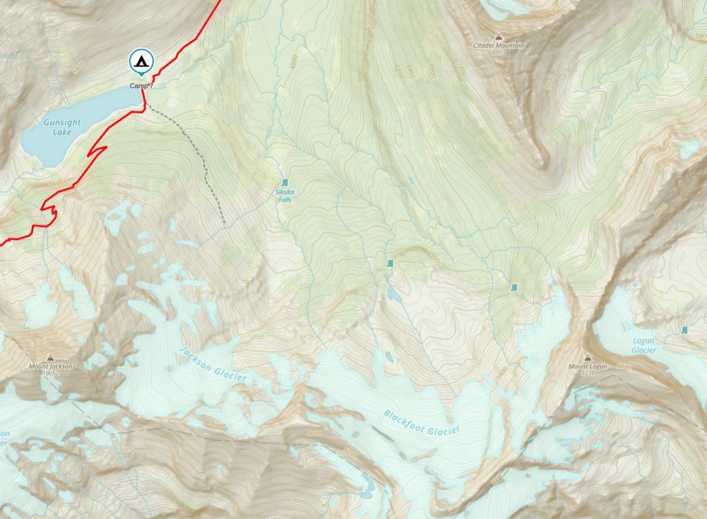 When we got to camp at Gunsight Lake, we found our tent site, sent up our tent, and hung up our food. Since the weather seemed to be holding, we headed east on the trail that got close to Jackson and Blackfoot Glaciers.