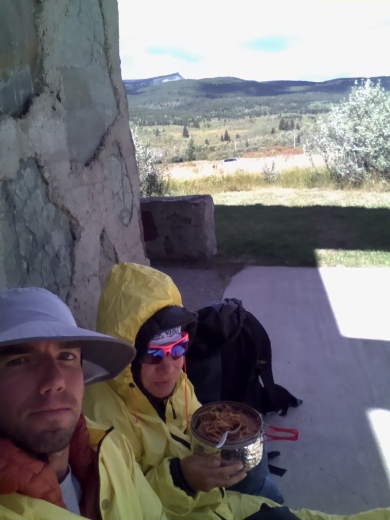 We got our better forecast which called for windy conditions with precip overnight- likely a couple of inches of snow in the high country. After unsuccessfully trying to get warm, debating our many options (as in bailing on Gunsight Pass for the next day), and talking with the ranger, we decided to just go for it. But first we decided to cook our dinner where we had some shelter from the wind and make up our tortilla wraps in case it turned rainy again later on (as was forecasted). In other words, we prepared for the worst possible conditions for our last 1.5 days of backpacking.