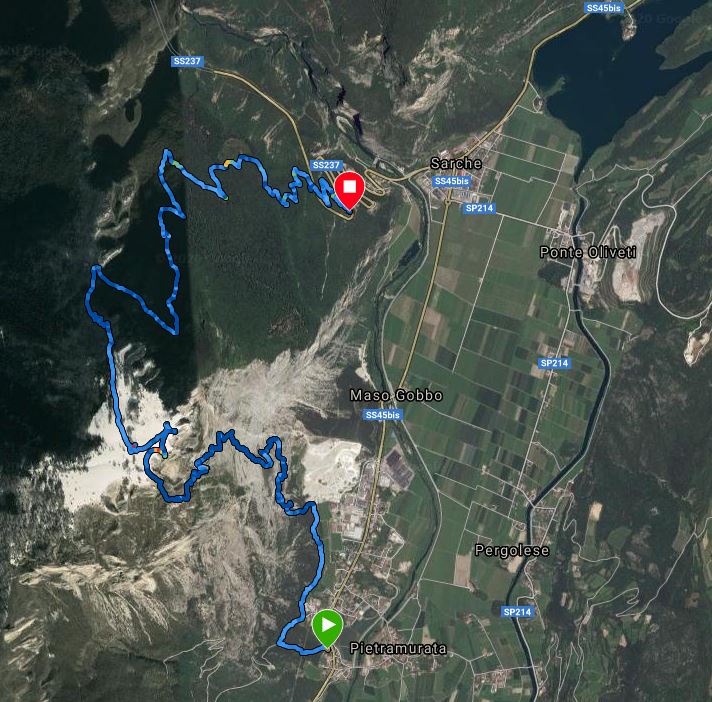 Once done with the big wall on the Che Guevara, we climbed to the very top of Monte Casale which was a broad field. The backside of the mountain has a road to the top! We eventually descended on the north side of Monte Casale to the town of Sarche were we caught the bus back to Riva del Garda. On that bus ride we learned what happens when the bus encounters a semi on a one-way road. Leave it to the crazy Italians!