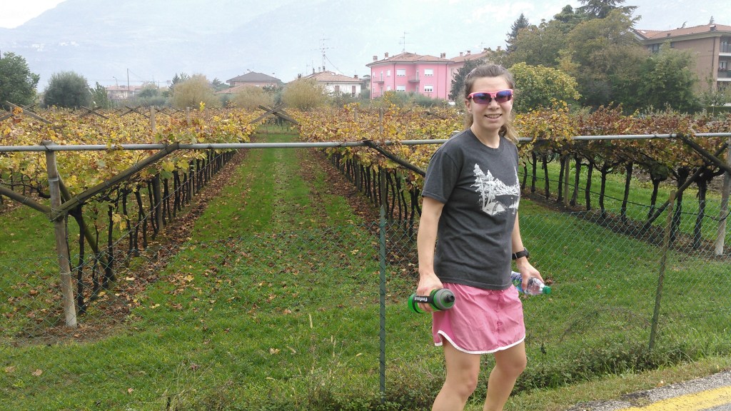 My plan for the day was to run to, and then do a short ferrata called Rio Sallagoni. It was getting late, threatening rain, but we quickly threw together a backpack with gear, water, and some food and took off running. We were glad that the clouds cleared. As we ran we passed many stucco houses and buildings and some vineyards.