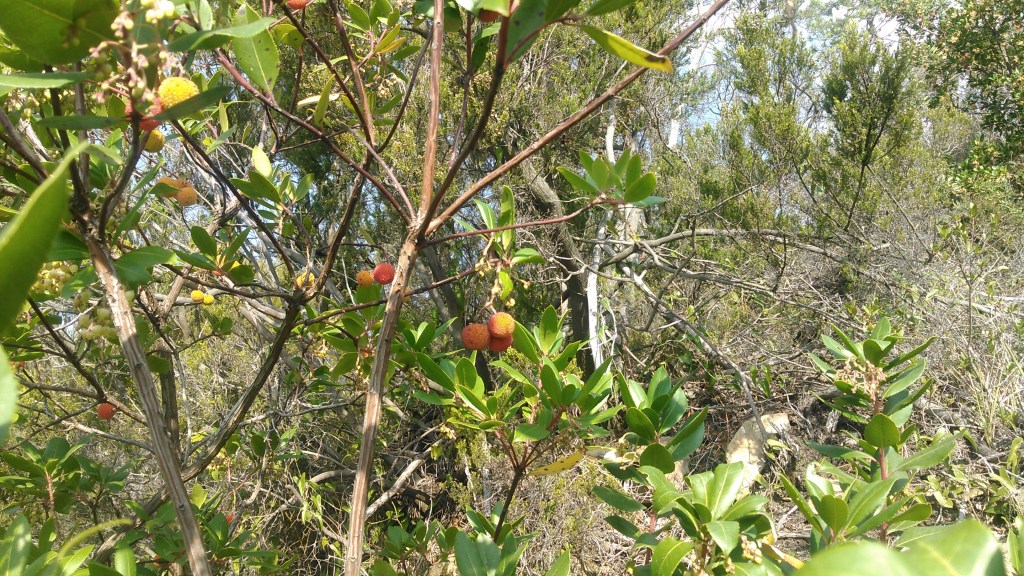 Instead we hiked the very long way up to the ridge and then back down. The vegetation was somewhat desert-like, especially near the coast. The trees got larger as we neared the ridge and we were disappointed that there weren’t any good views through the trees on the ridge. The trees on the inland side of the coast were all bigger than those in Cinque Terre. These included pine trees and some weird trees that had fruits that kinda looked like strawberries.