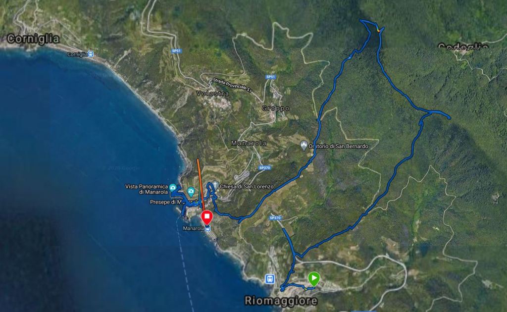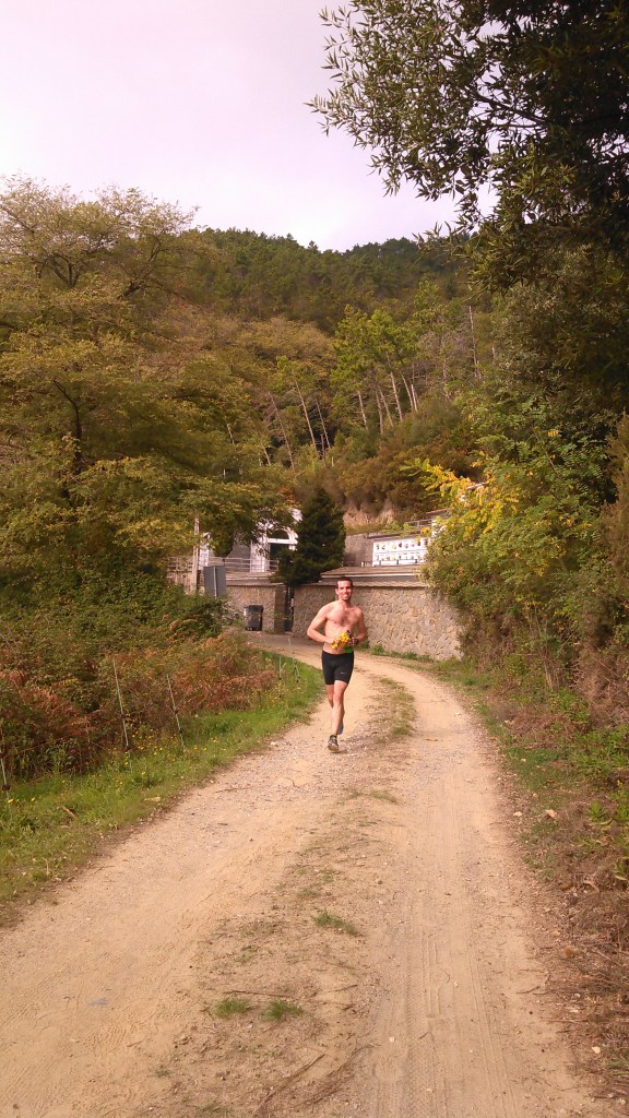 We didn’t know exactly how long this run would be but overestimated the distance. The route took us along a gravel road about 1200 feet above sea level. Here the vegetation was still fairly sparse and as we made our way in and out of re-entrants we had great views looking out to the sea and ahead to Volastra.