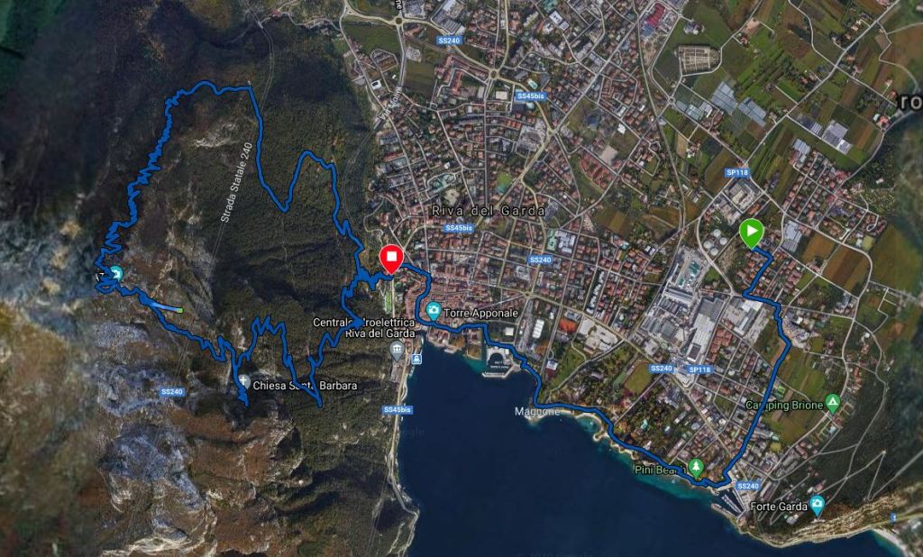 Overnight it snowed up on the high peaks which created a nice juxtaposition with the palm trees outside our Airbnb. Today’s goal was another ferrata route- the Centenario SAT. We started out by walking along Lake Garda and then into the main old town of Riva del Garda to begin our hike. Oh, this was a cute old town and I was stoked to get back down from the ferrata to spend more time there.