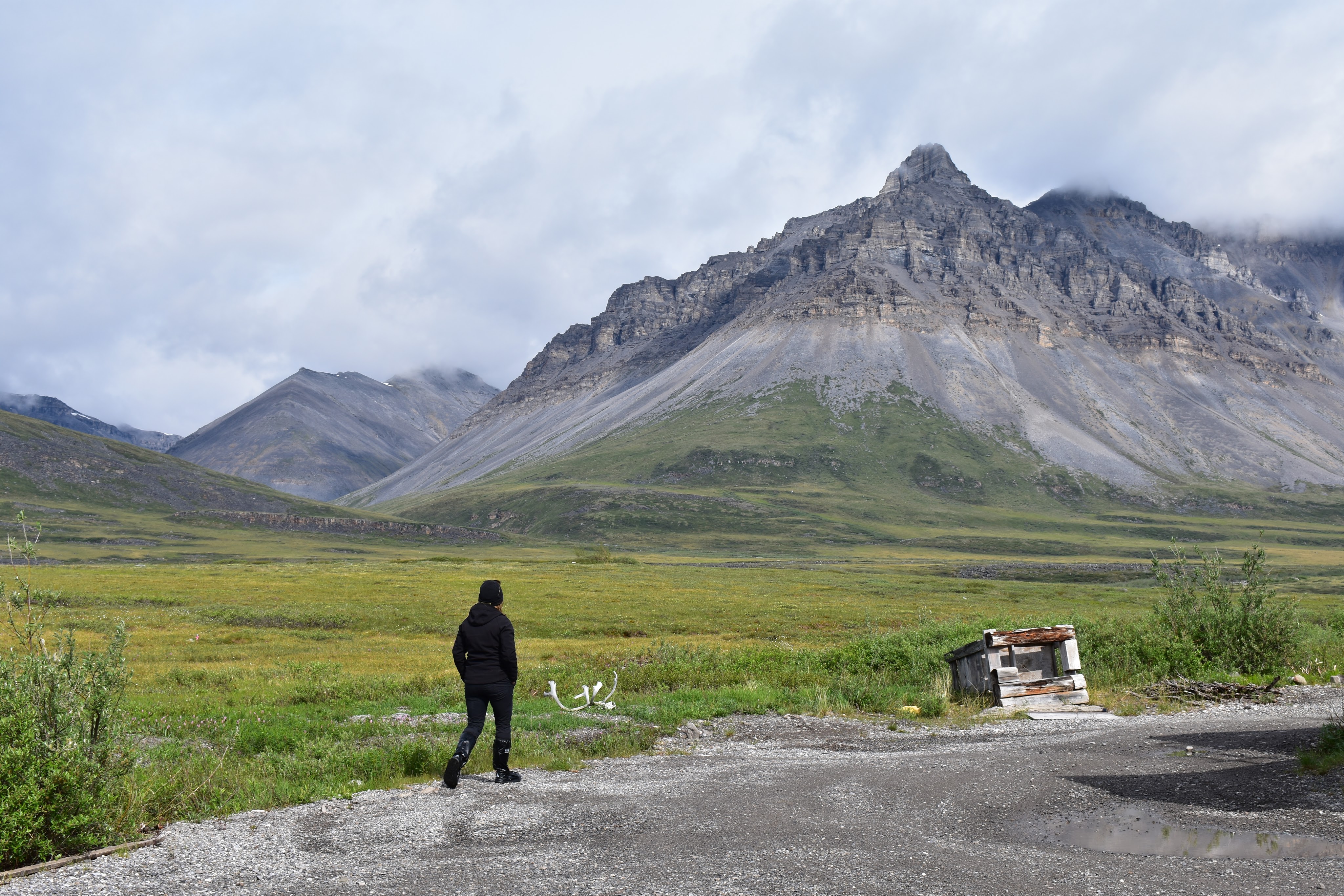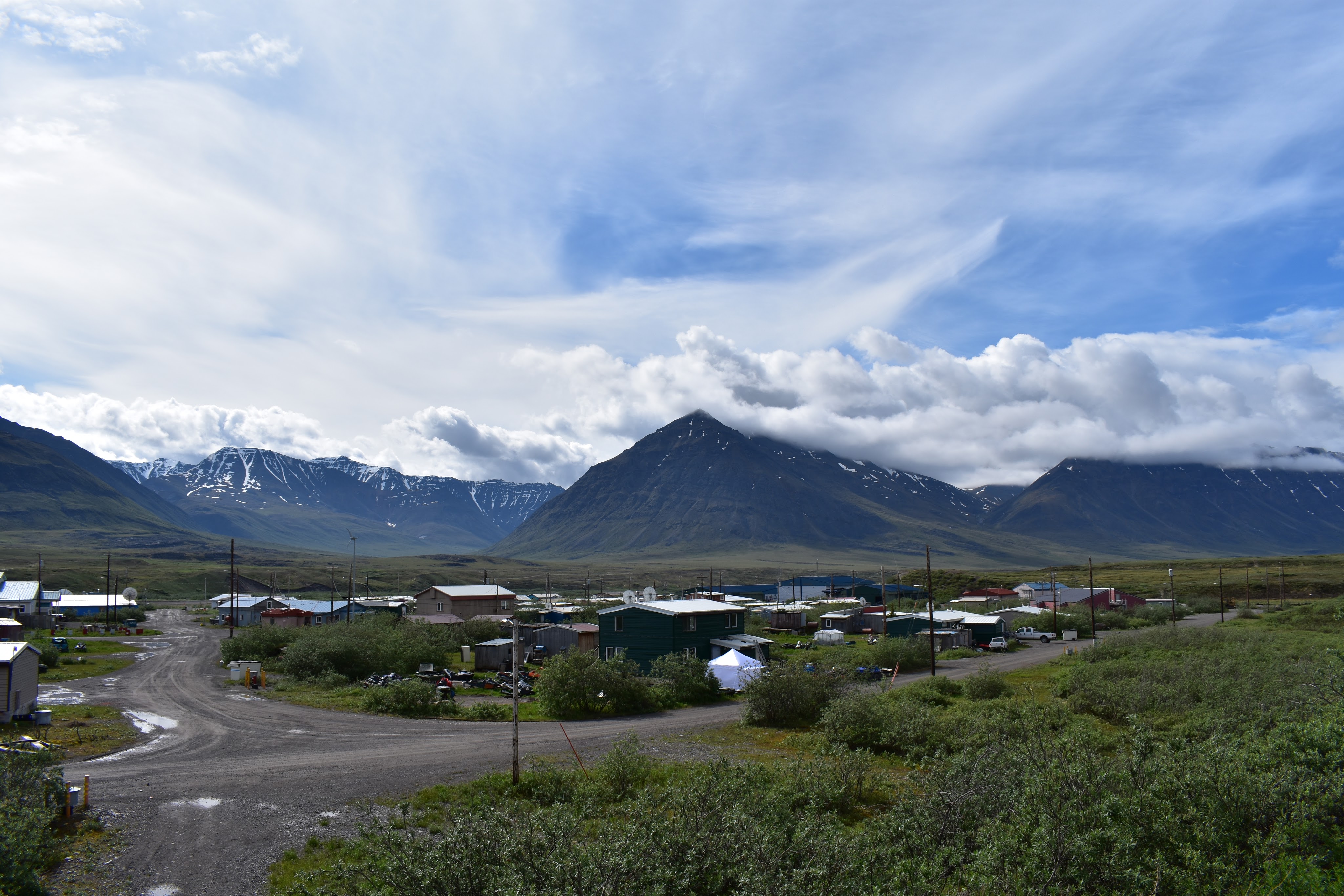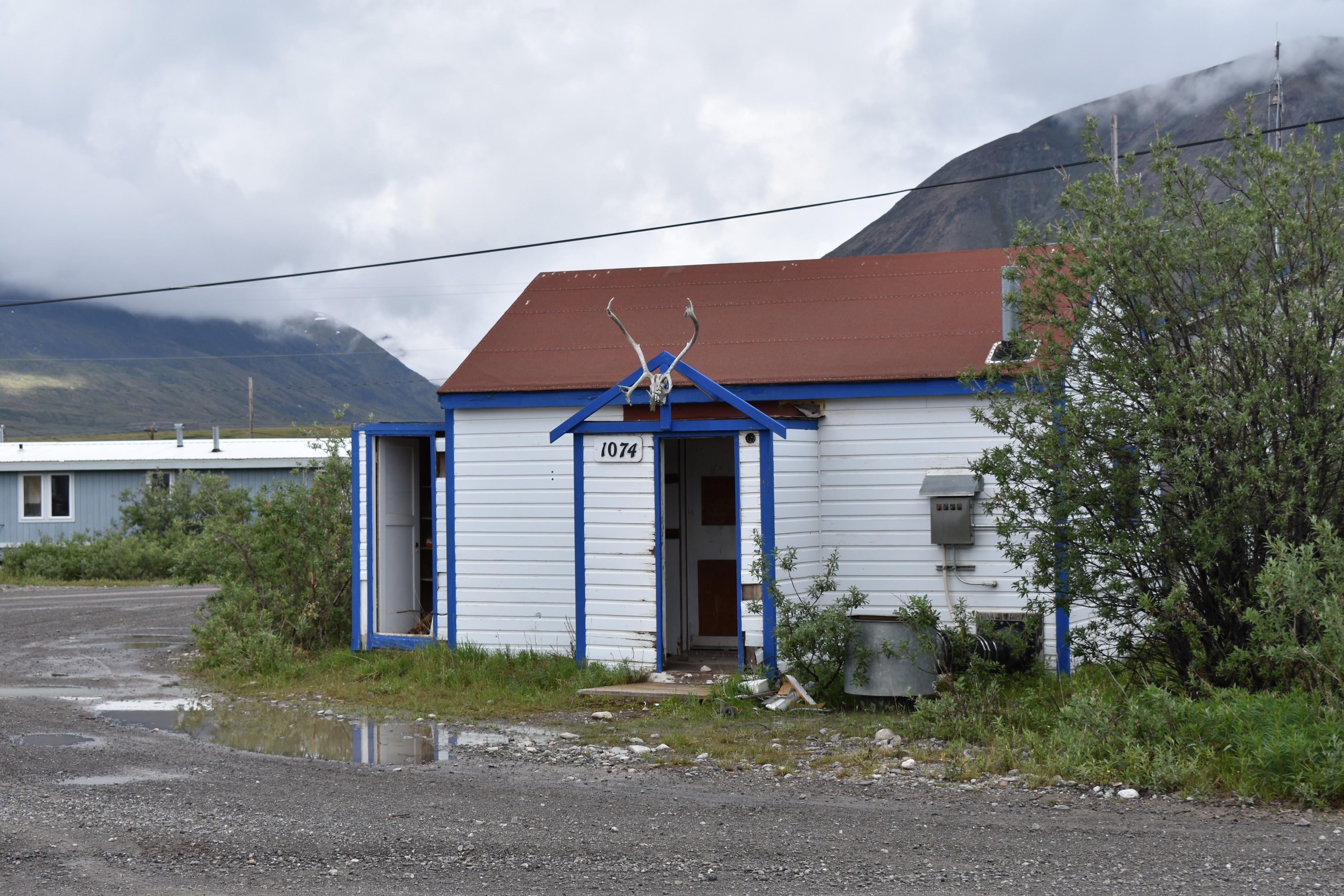 The town was incredibly sleepy. There were a number of small residences, all adorned with caribou antlers above the front door. No one was milling about. There was no big sign for the store. We stopped by the Simon Paneak Memorial Museum but it was closed. After a snack, we started off east and slightly north to head into the valley with the Anuktuvik River, around noon.