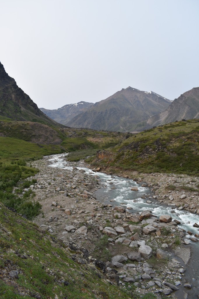 As we hiked on, the grasses and shrubbery got taller and thicker. It was still mostly easy going. At one point we walked down a side river. Then Ernie Creek entered another gorge and we climbed above it on the right bank. Here we got our first views of the “Gates” of the Arctic- Frigid Crags on the right and Boreal Mountain on the left. We could tell our energy was waning. This wasn’t a great place to camp- it lacked great water access as we were 30 feet above the river on a cliff, but it had a great view. Erik and I also needed to patch our packraft so we set up camp.