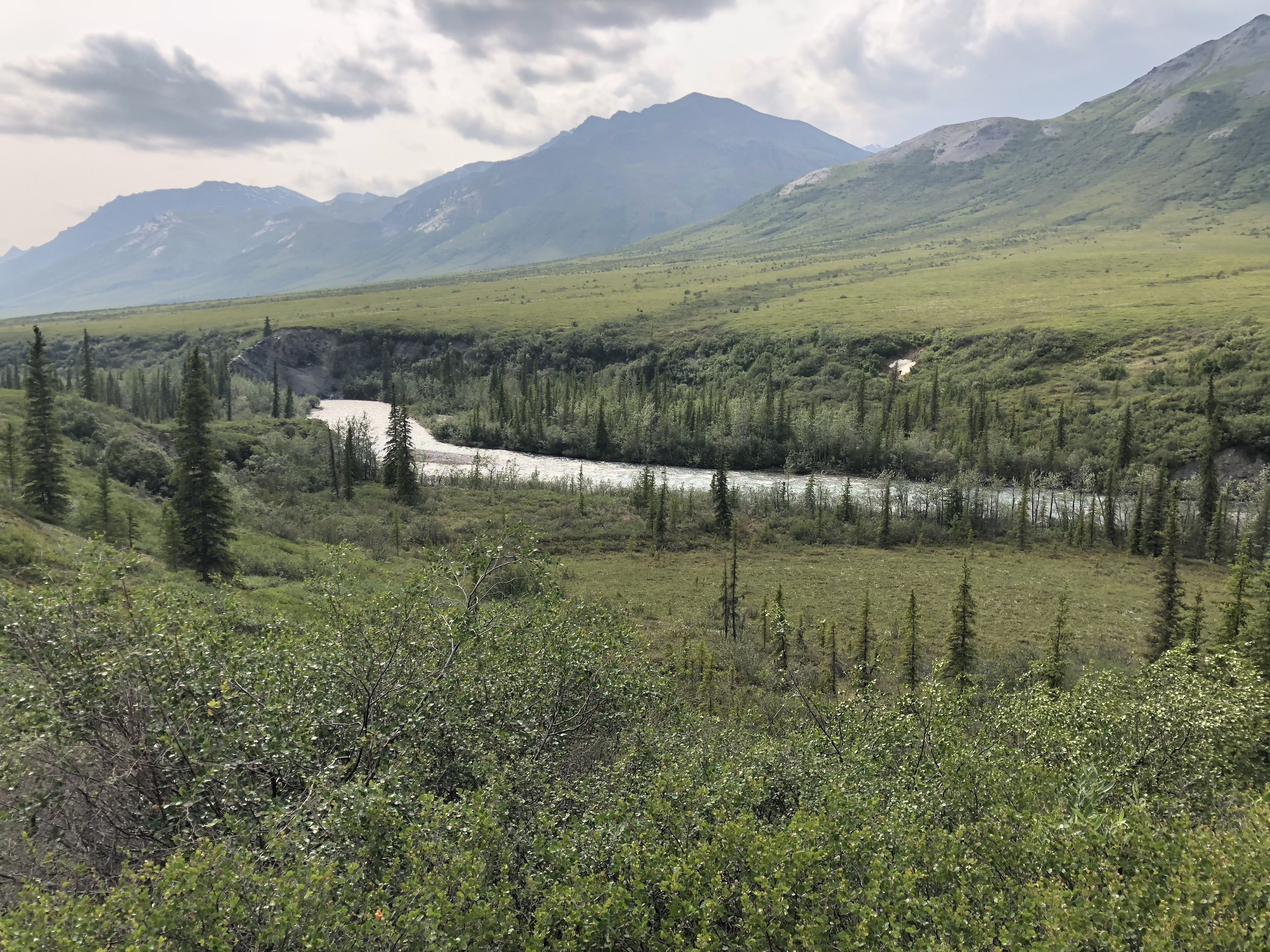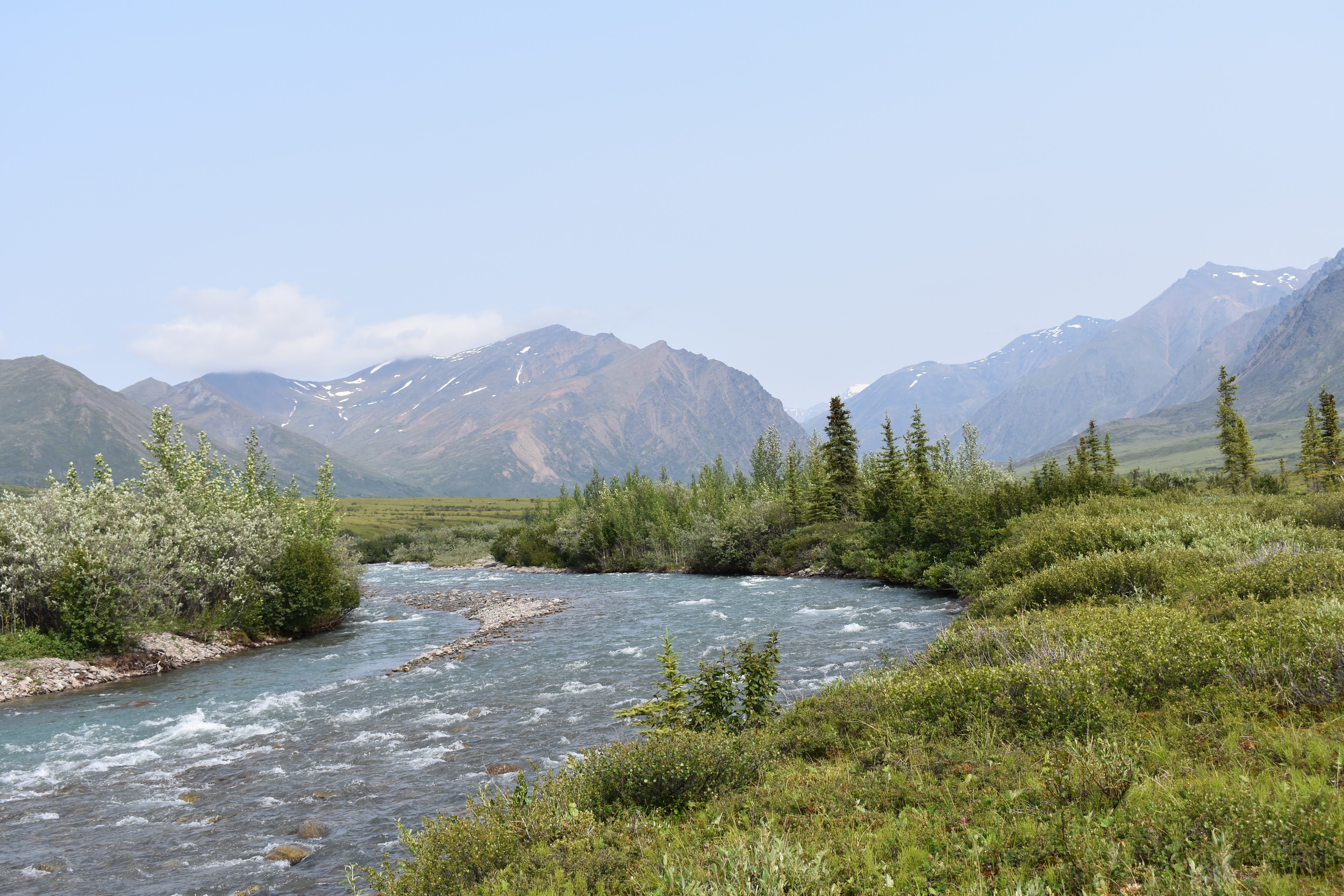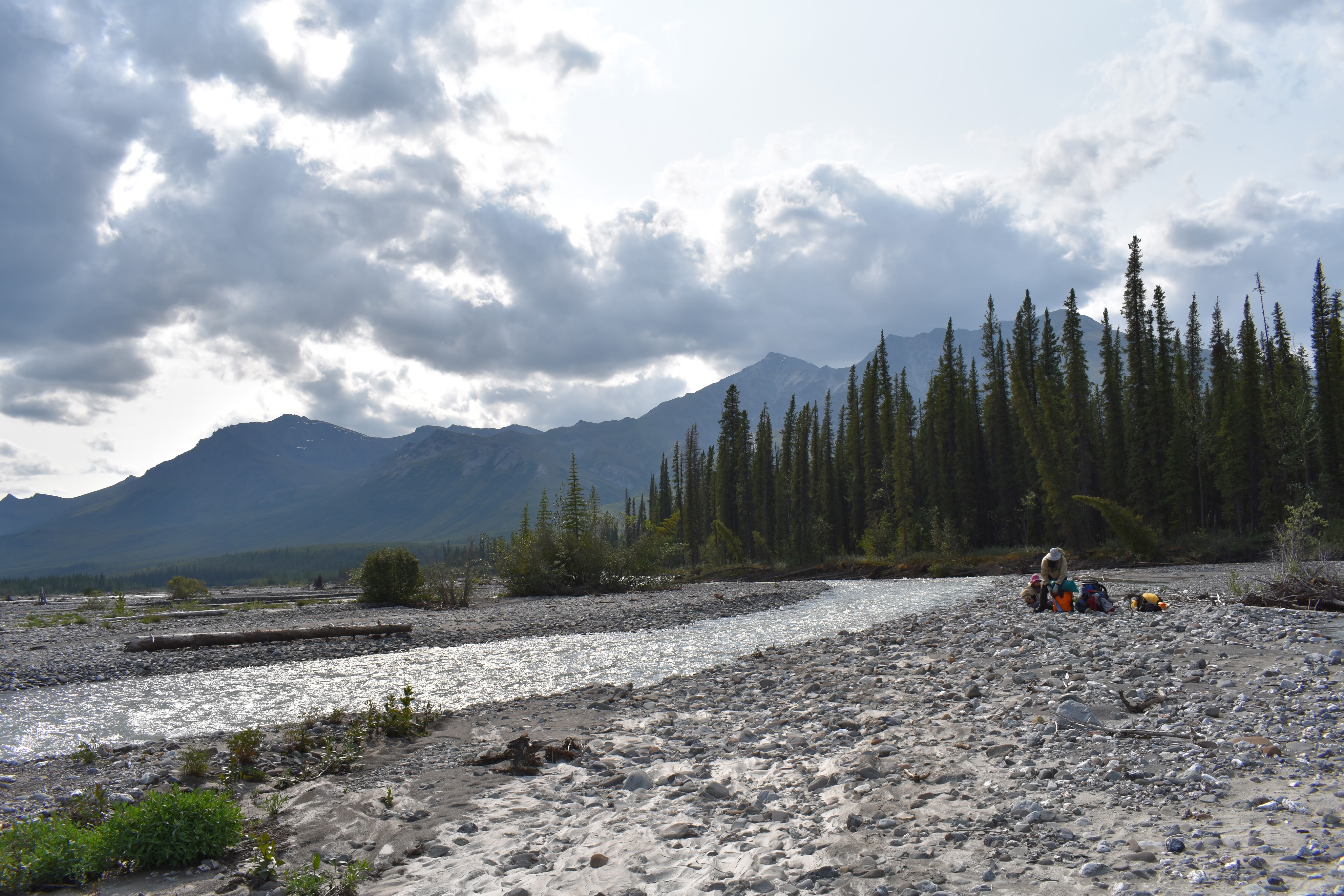 This was likely a good idea as soon thereafter Ernie Creek ran into its last gorge and that looked way too thrilling. Up above the gorge, we had great views of the Gates before we headed into the forest, down to the North Fork of the Koyukuk River. It was weird being in the trees again. The forest wasn’t too thick and it was easy hiking.