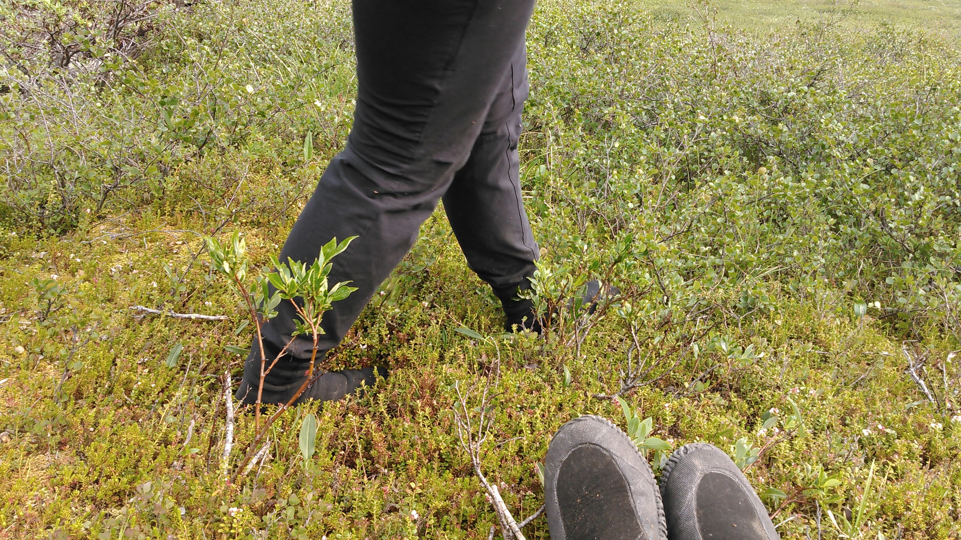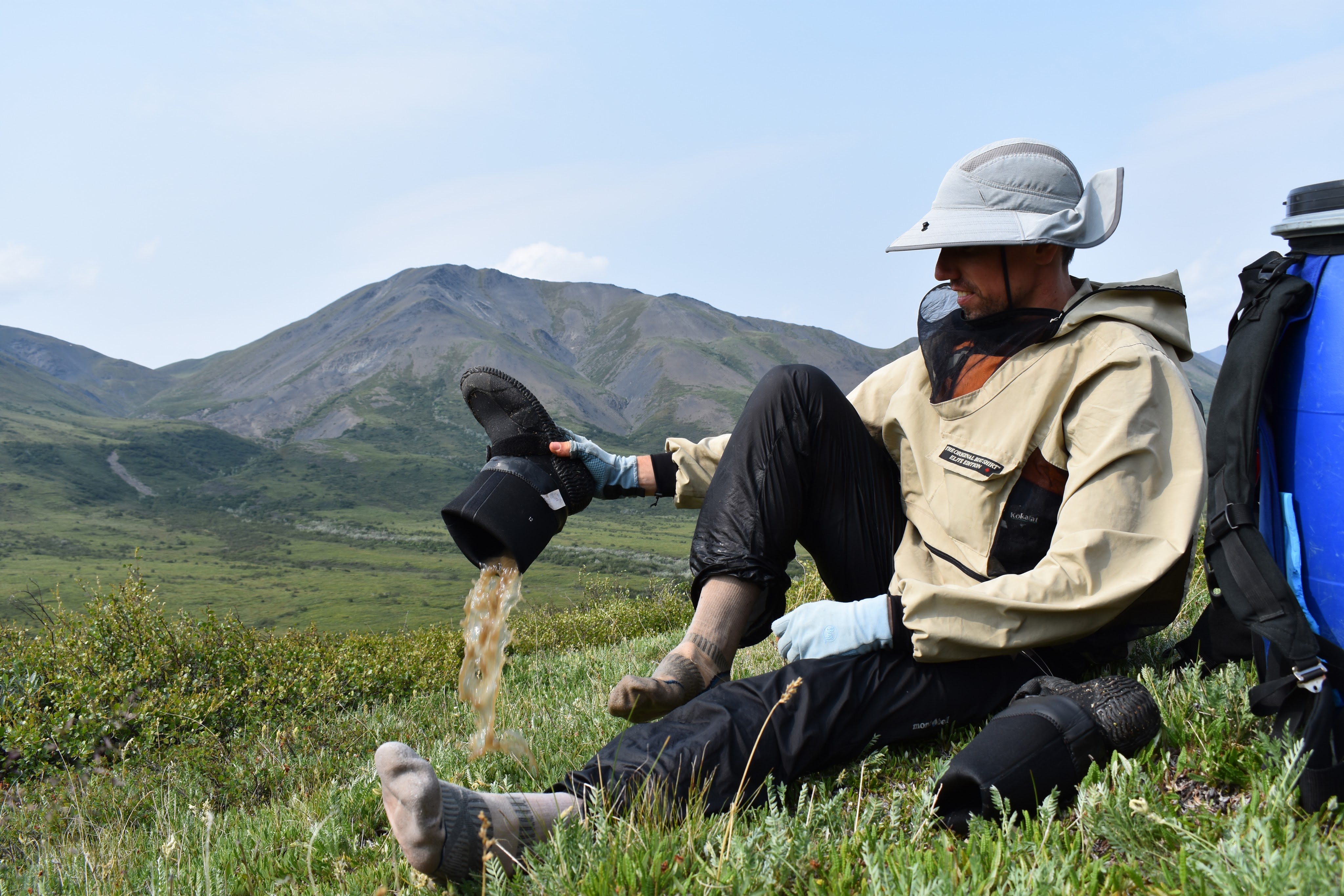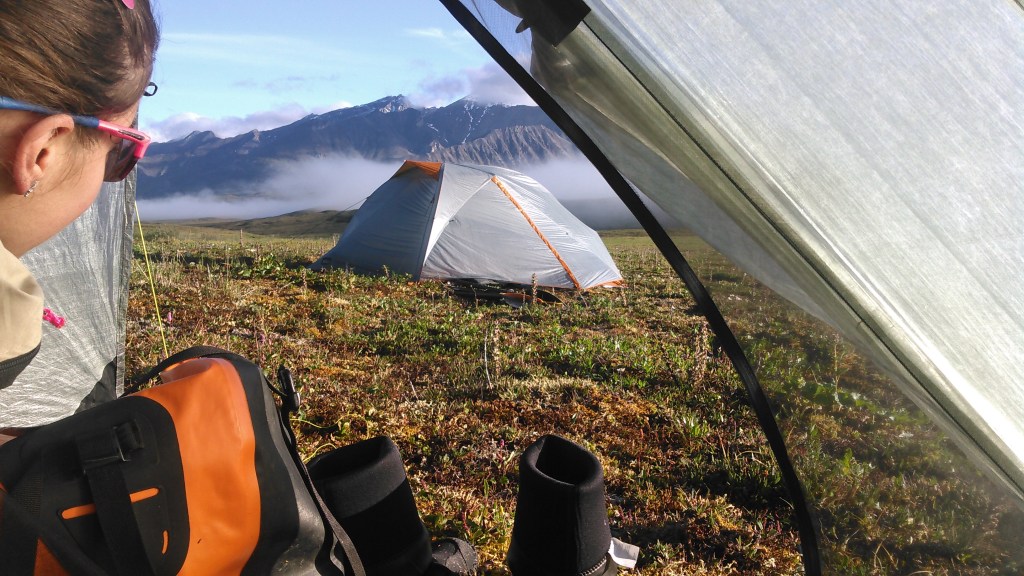 Previous to our trip, we heard we’d be walking on the tundra on tussocks, grass that grows in clumps. Between these clumps the dirt erodes away and so it’s difficult to walk. We also heard this area was wet, wet, wet. As we flew into Anuktuvuk Pass, we could see the water catching the sun everywhere on the ground and up the sides of mountains. To prepare for this wetness, we bought “Alaska” NRS boots (the style we got are no longer available). These were key.