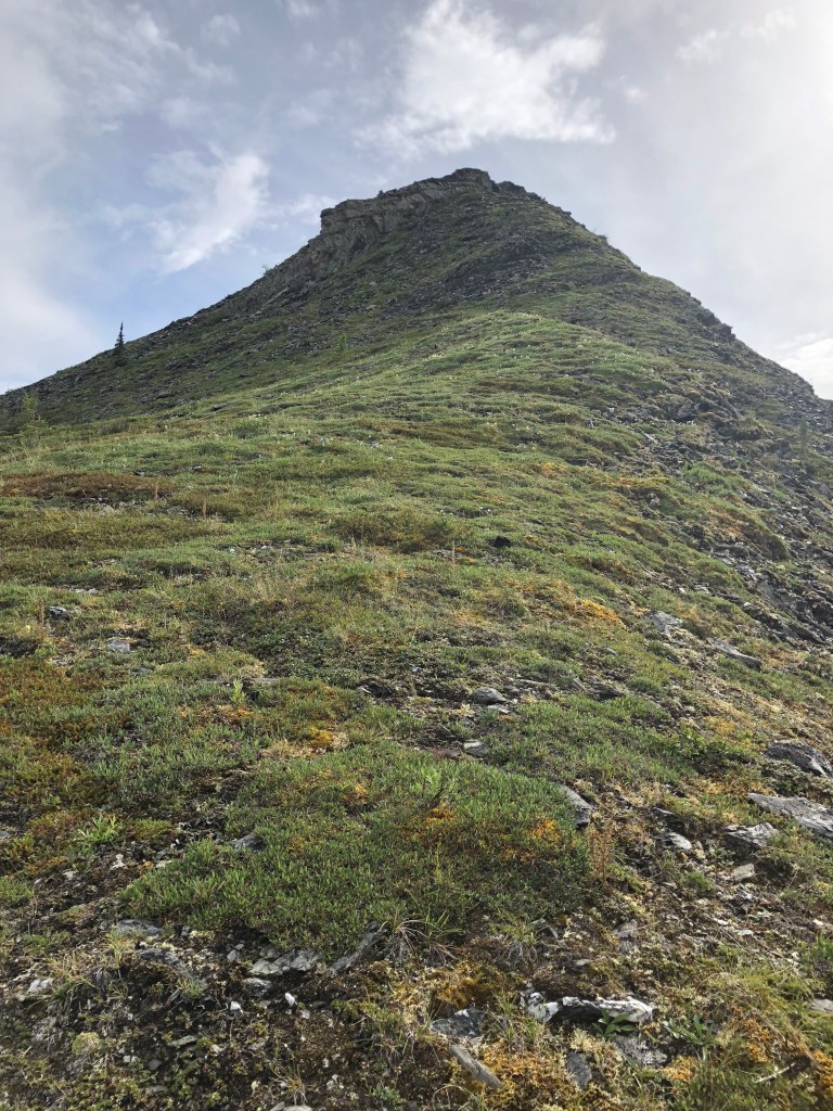 I declared we take a layover day and climb the mountain to the south of Ernie Pass. I scouted a route on our map, then got out of our tent to take a look. The northwest ridge looked possibly do-able but like we might get cliffed-out so even though it was farther, we walked around to the more gradual northeast ridge.