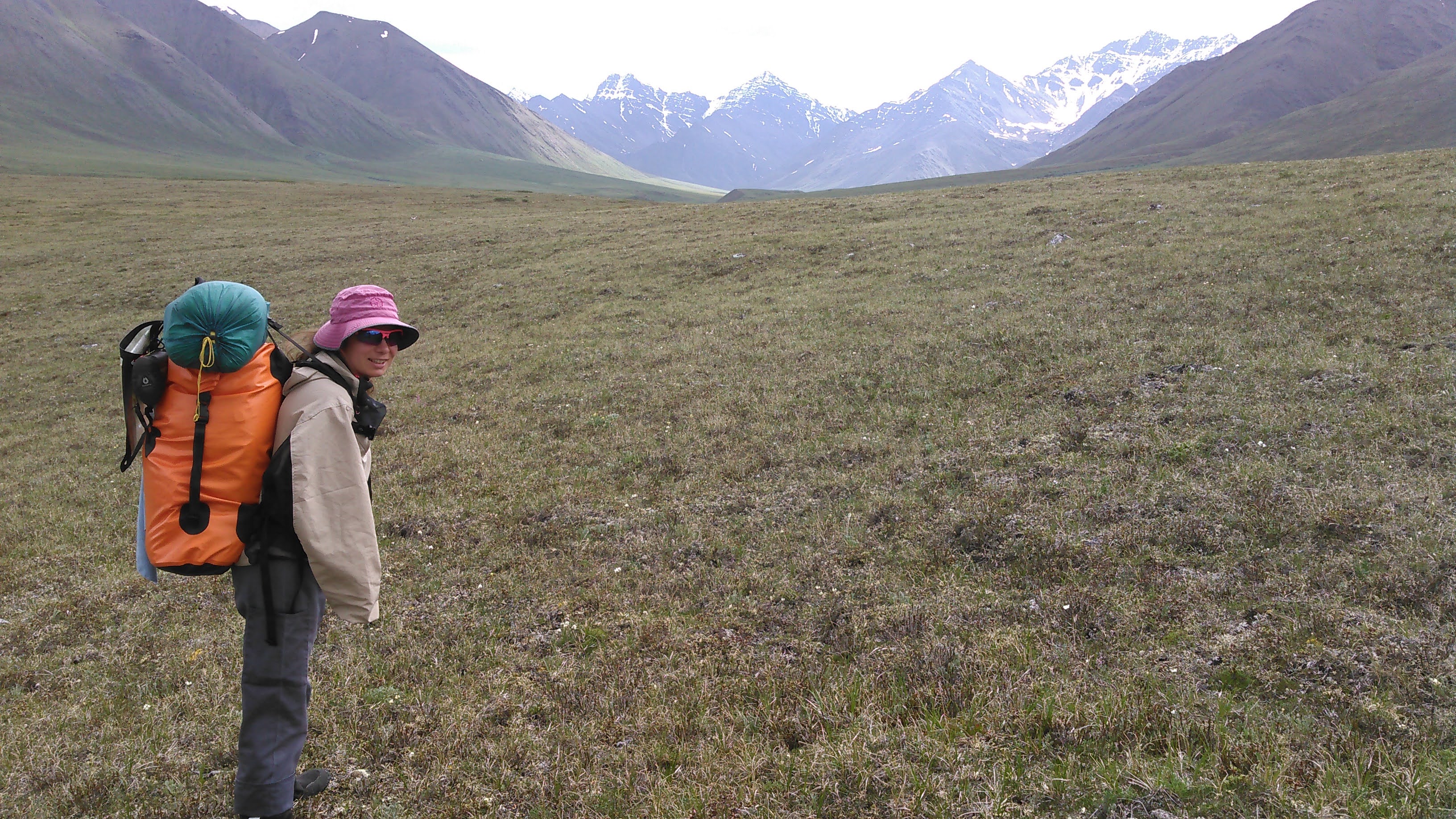 The scenery was spectacular as we hiked along the south side of the Anuktuvuk River. Unfortunately our packs were quite heavy. Sarah and I both had 70 liter SealLine Dry Packs. These are not good for carrying heavy loads for long periods of time. I had all of the gear for Erik and I, including our packraft but minus our food. My pack only weighed 32 pounds but without any kind of frame, all the weight rested on my shoulders and not my hips, even with the hip belt as tight as it would go.