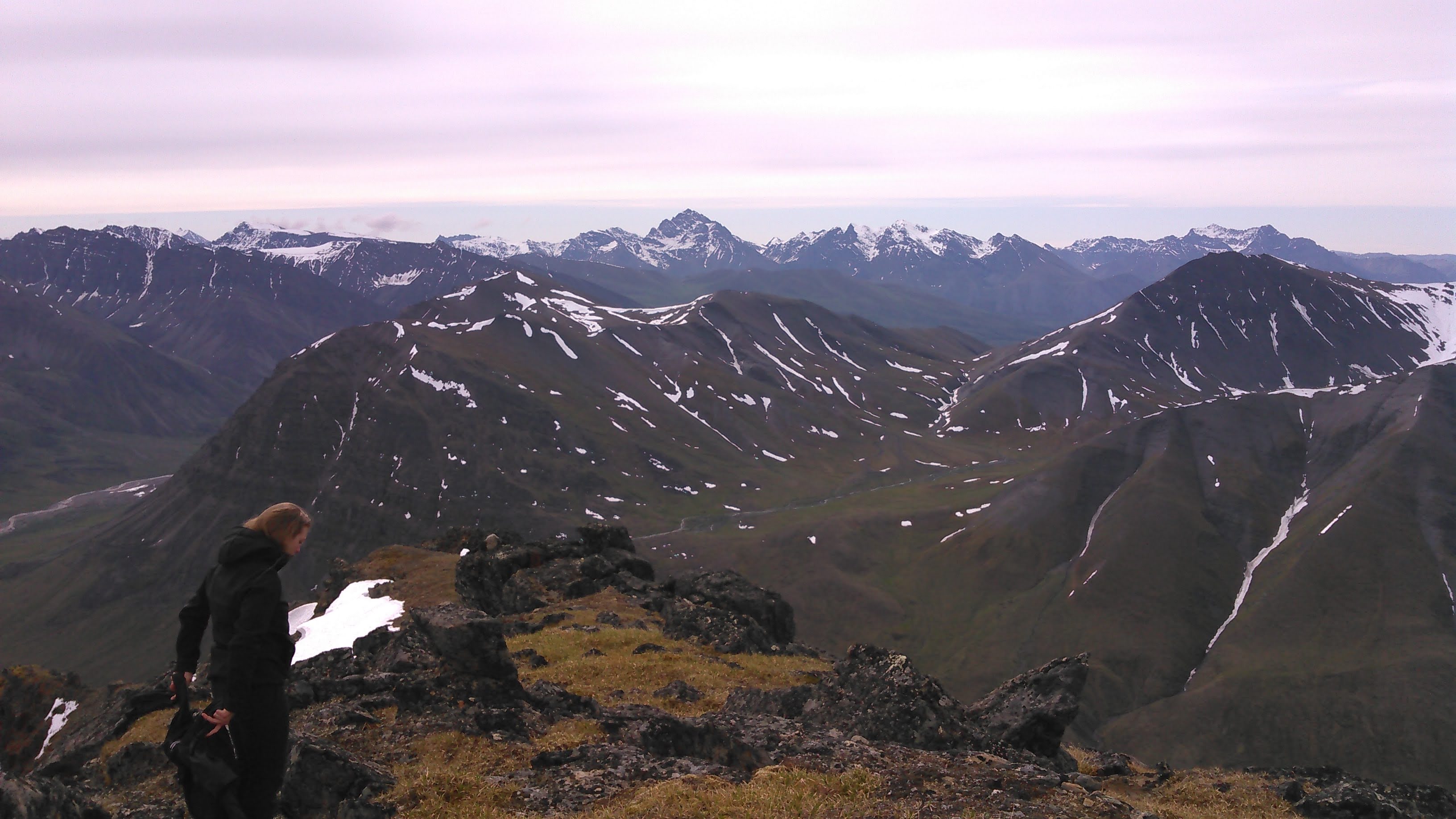 Many false summits later, we arrived at the true summit. From here we could look down to the southeast over the very eroded face. Unfortunately the view to the south with the confluence of the Tinayguk and Koyukuk Rivers was obstructed by the long ridge of Eroded Mountain but otherwise the view was amazing.