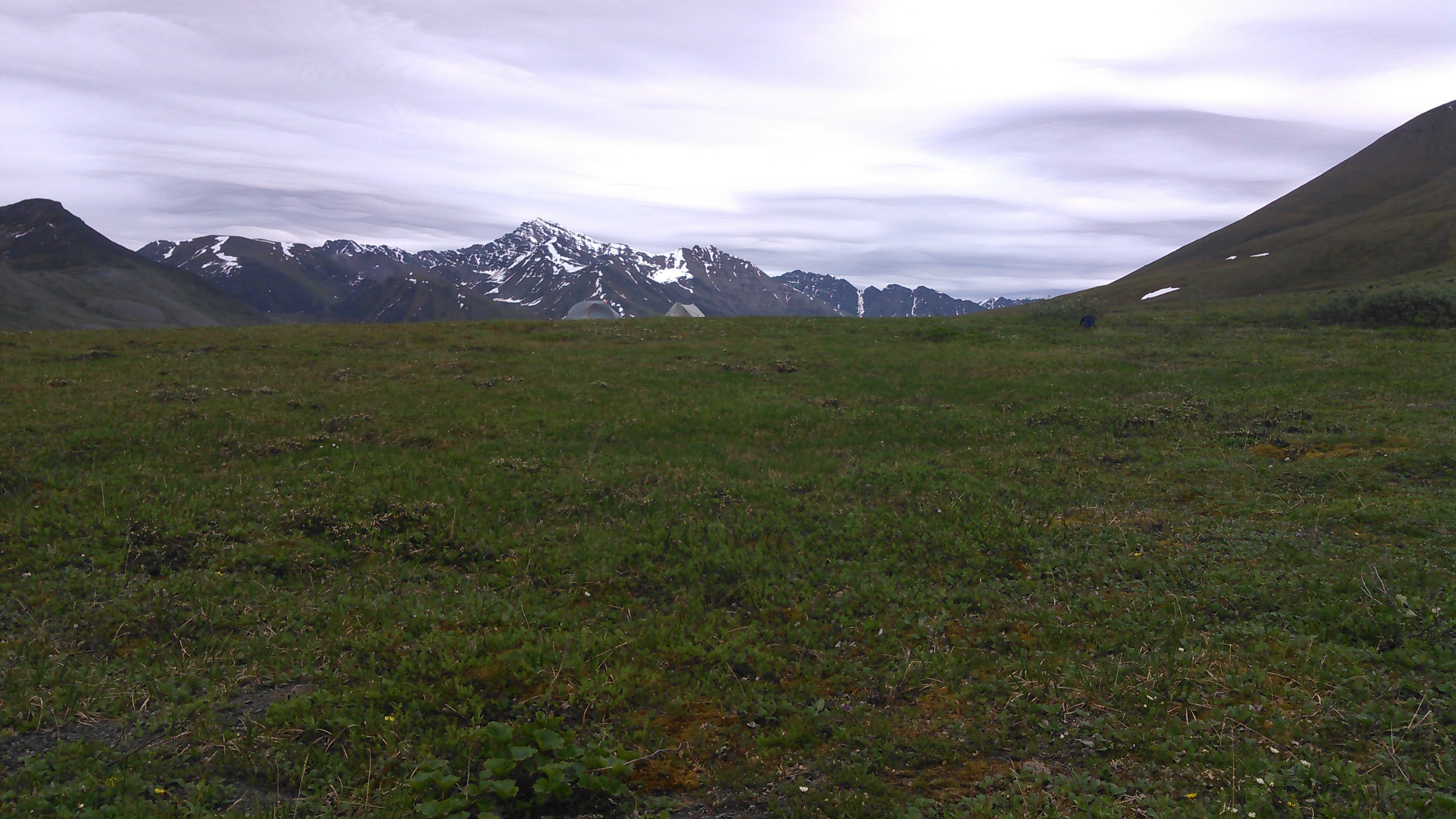 We found a dry place to camp on a very minor ridge- not an easy thing to do amidst the wet ground. The sun never set on our trip and so we took a leisurely hike part way up the mountain to the south to enjoy the scenery after dinner.