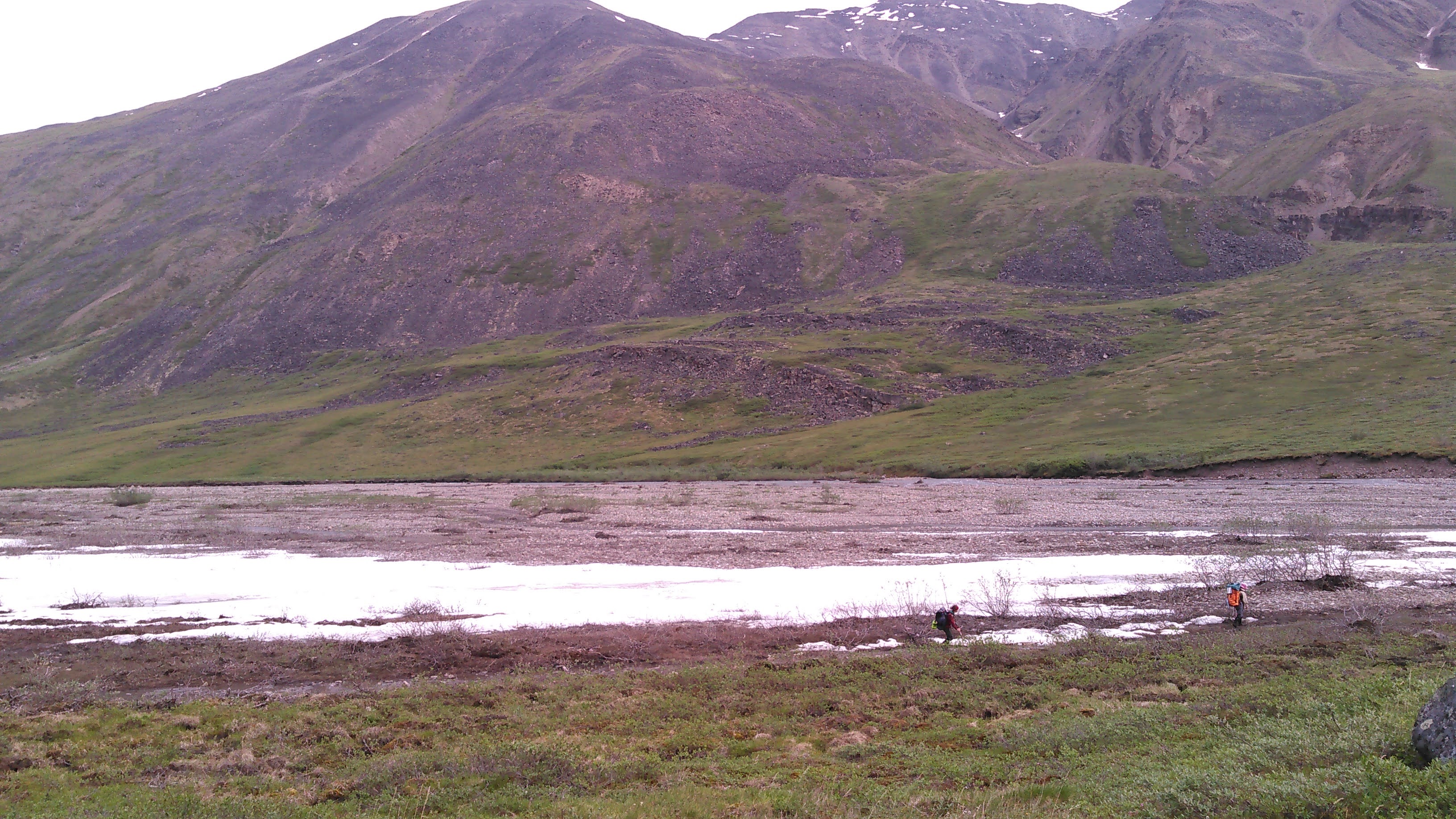 Ernie Creek was flowing fast here, was narrow, and very shallow, only about a foot deep. We were excited to paddle though. After inflating our packrafts, we bumped down the river, hitting the rocks on the bottom for a couple hundred meters, before deciding to backpack again. Erik and I got a small hole in the bottom of our raft.