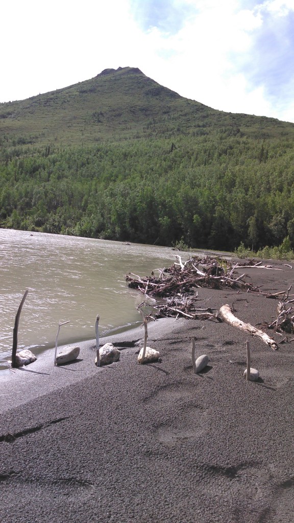 We had some plans of climbing Frigid Crags and so we found a campsite on river right, just above Kachwona Creek. The landing was difficult, up a 5 foot steep sand bank. Somehow we made it up but it wasn’t easy. The other places to land on the mainland (not on a gravel bar island) were covered with thick underbrush. It was obvious the moose liked our campsite and there seemed to be some “trails” that were likely overflow channels from high water.