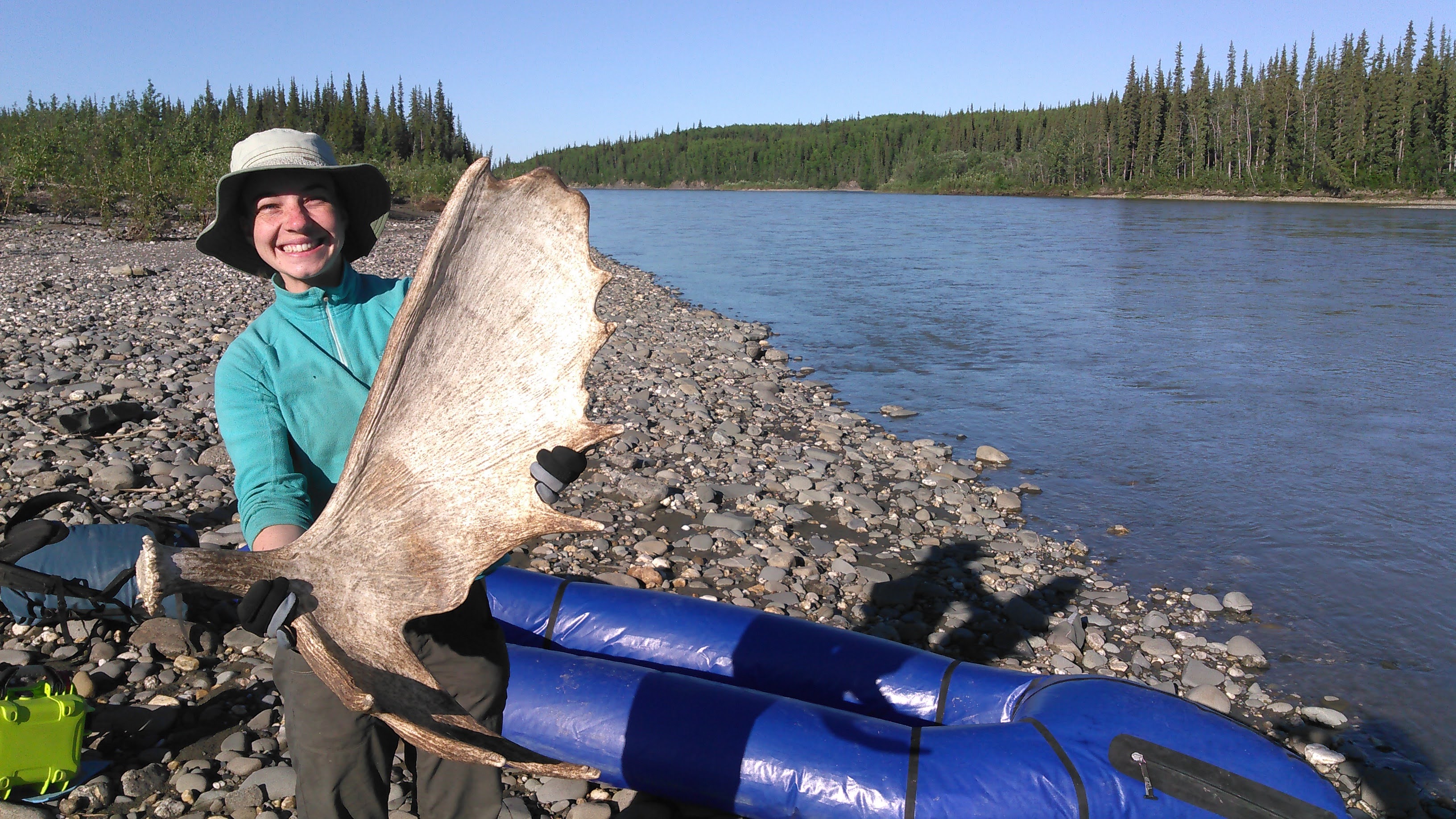 Sarah was hoping to bring home a rack but this isn’t allowed in the national park. Finally we were camped outside the national park and while walking around our island she found a nice moose shed!