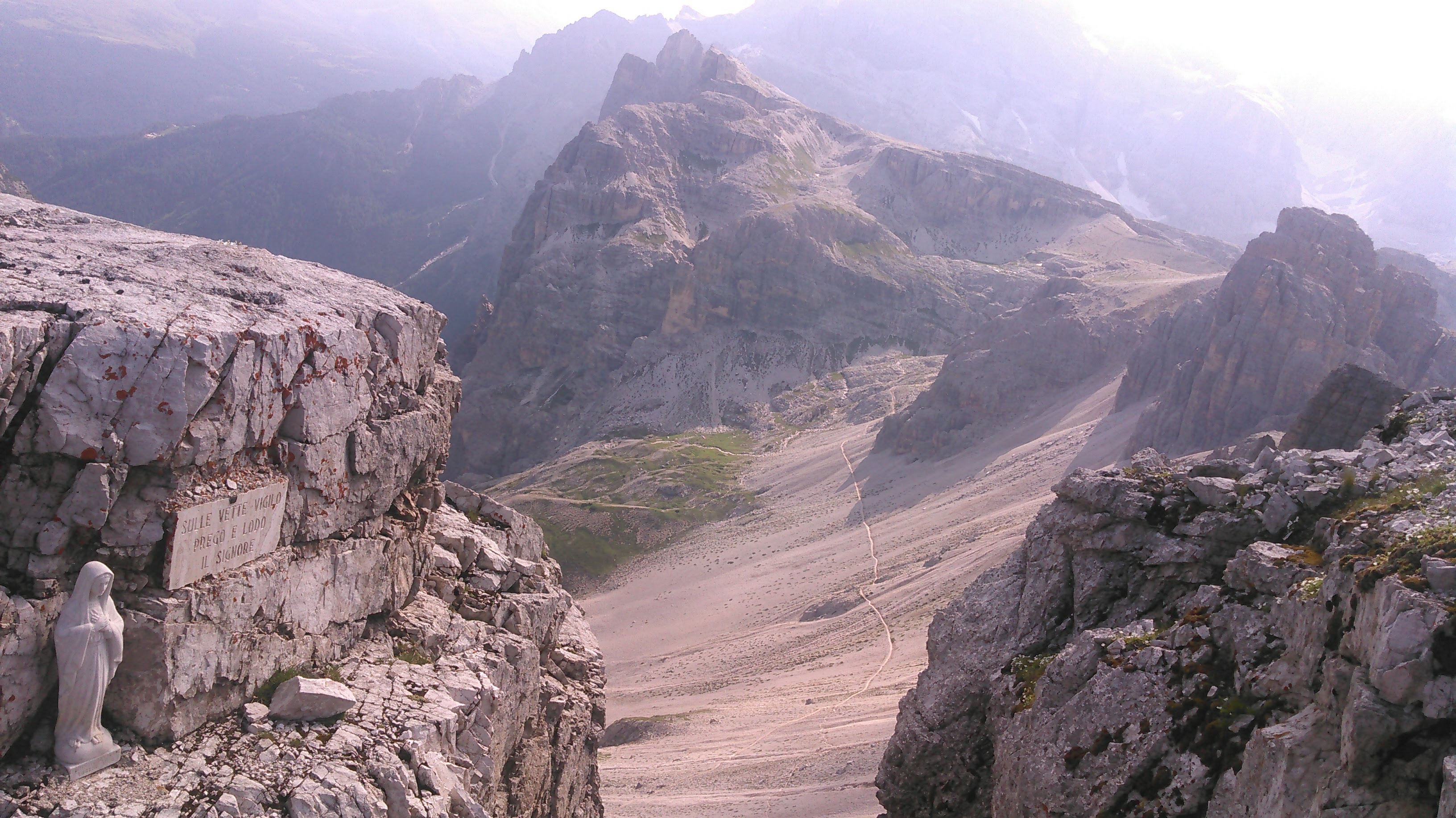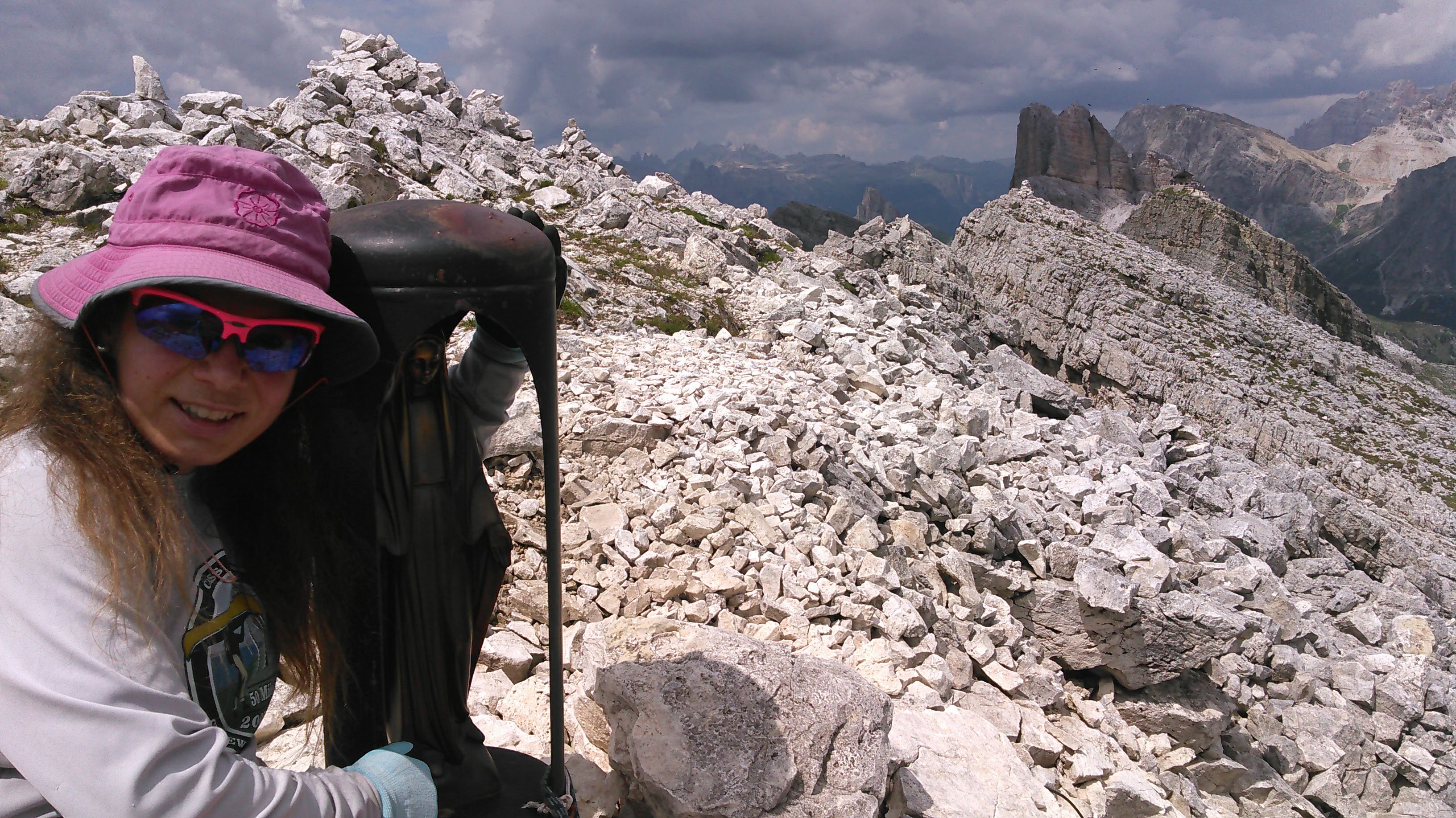 After hiking for 3 hours and 6 miles, we got to the first ferrata, Ray Gusela, located along the east side of Nuvolau which has two prominent summits. This was hardly ferrata-worthy. I put on my climbing harness before we started up this ferrata but never clipped in. It was so easy I would have brought along my 2-year-old niece. This was really a Class III climb and incredibly well protected in a gully. Once done with the ferrata, we detoured to the east summit where of course there was a virgin Mary. This is Italy after all!