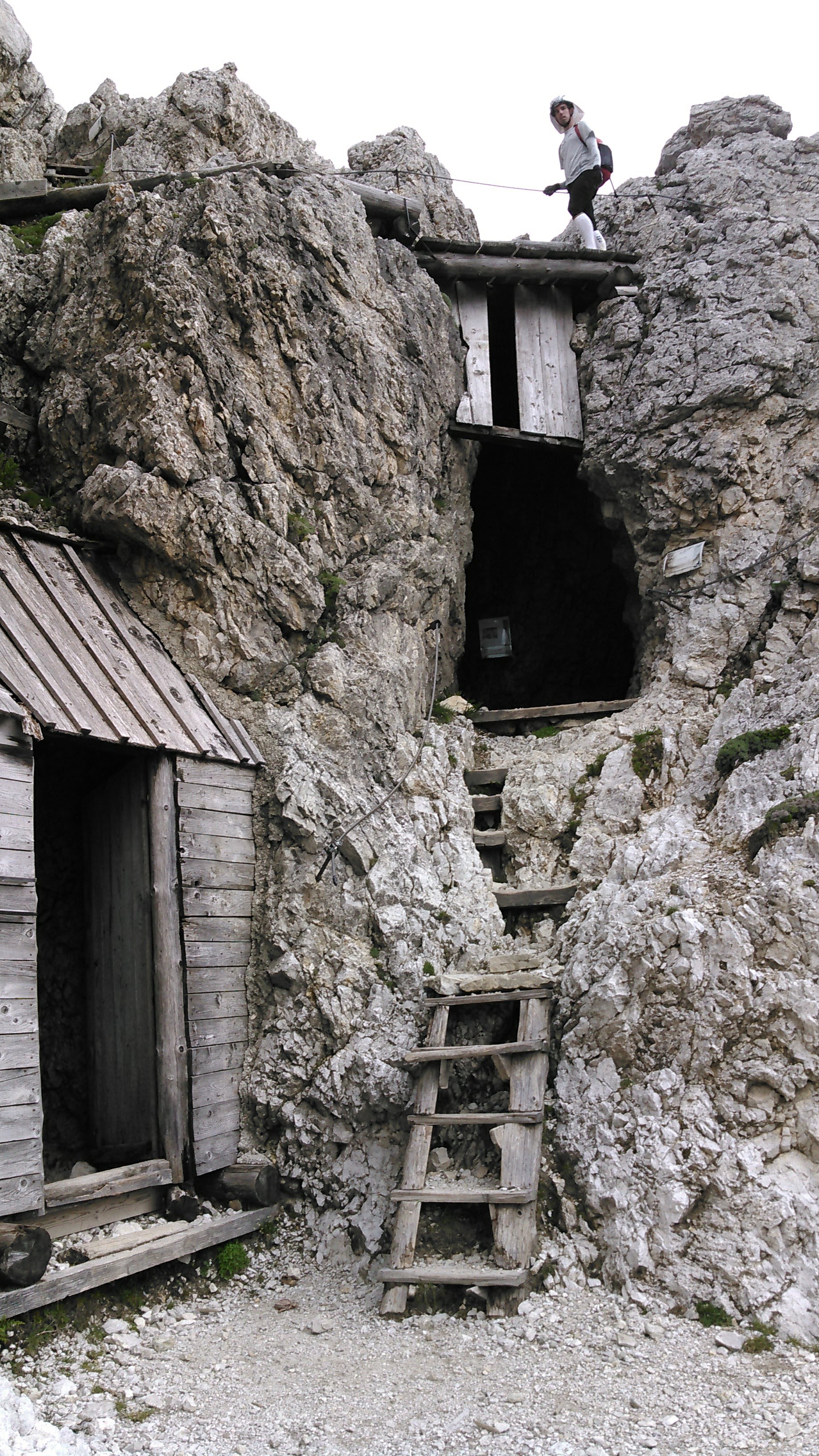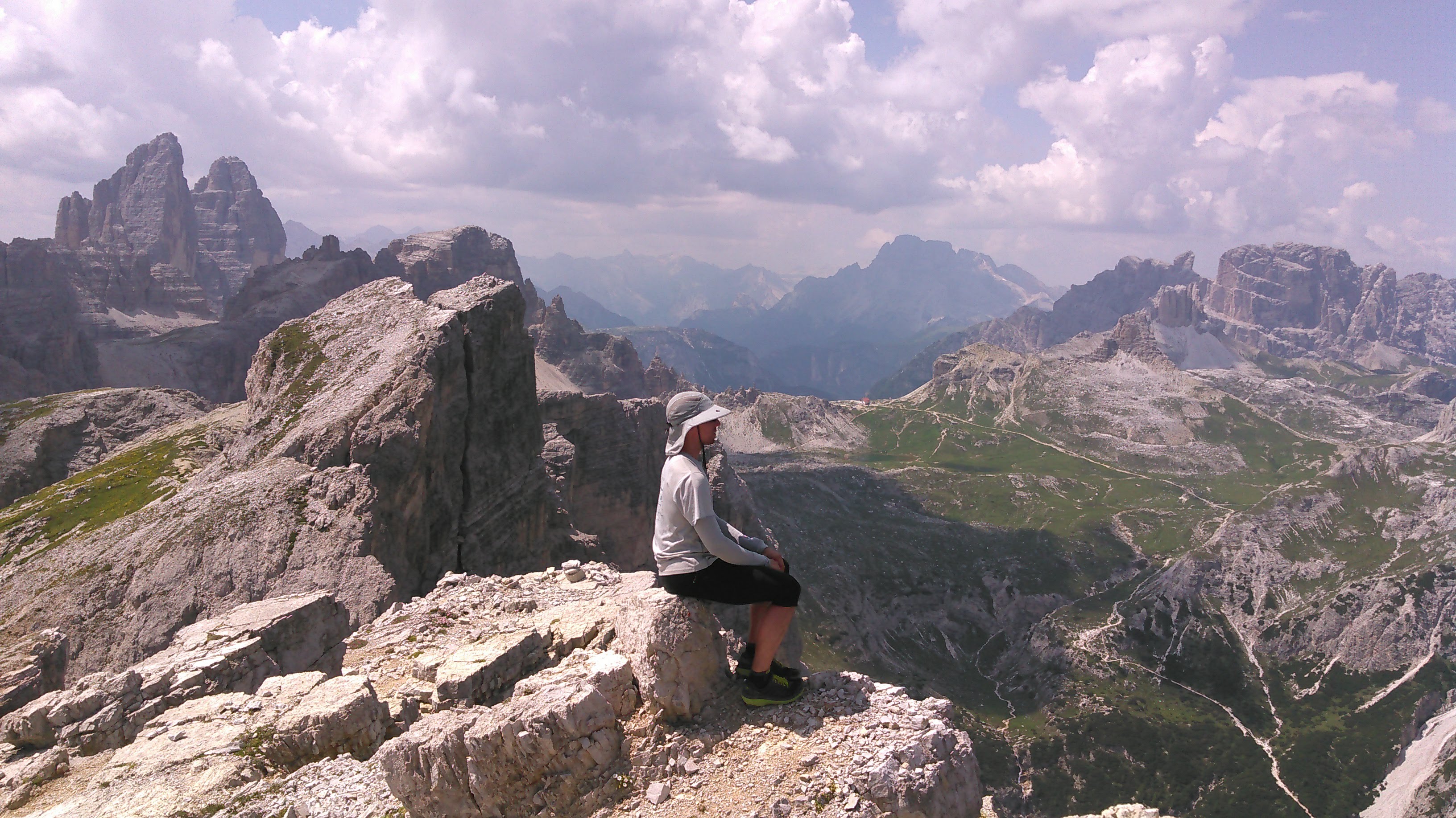 There’s ferrata on both sides of the pass (Forcella la del Camoscio) but if you approach from the north side, from Rifugio Locatelli, like we did, the ferrata goes through tunnels! Overall the ferrata was fairly short but after the pass it got confusing to follow. We kept contouring around to the west when the actual route when north (others did the same). If you get to a gully that looks difficult, back track and keep looking up. The maps are not detailed enough to show the exact route. Where we got off-route, there was a steep unprotected section (meaning no cables) where we had to do some bouldering. From there to the top was relatively easy going without any cairns marking the route. There were lots of people up there the day we did it, but if the mountain was in the clouds and visibility low, it would be difficult to find where to go back down.