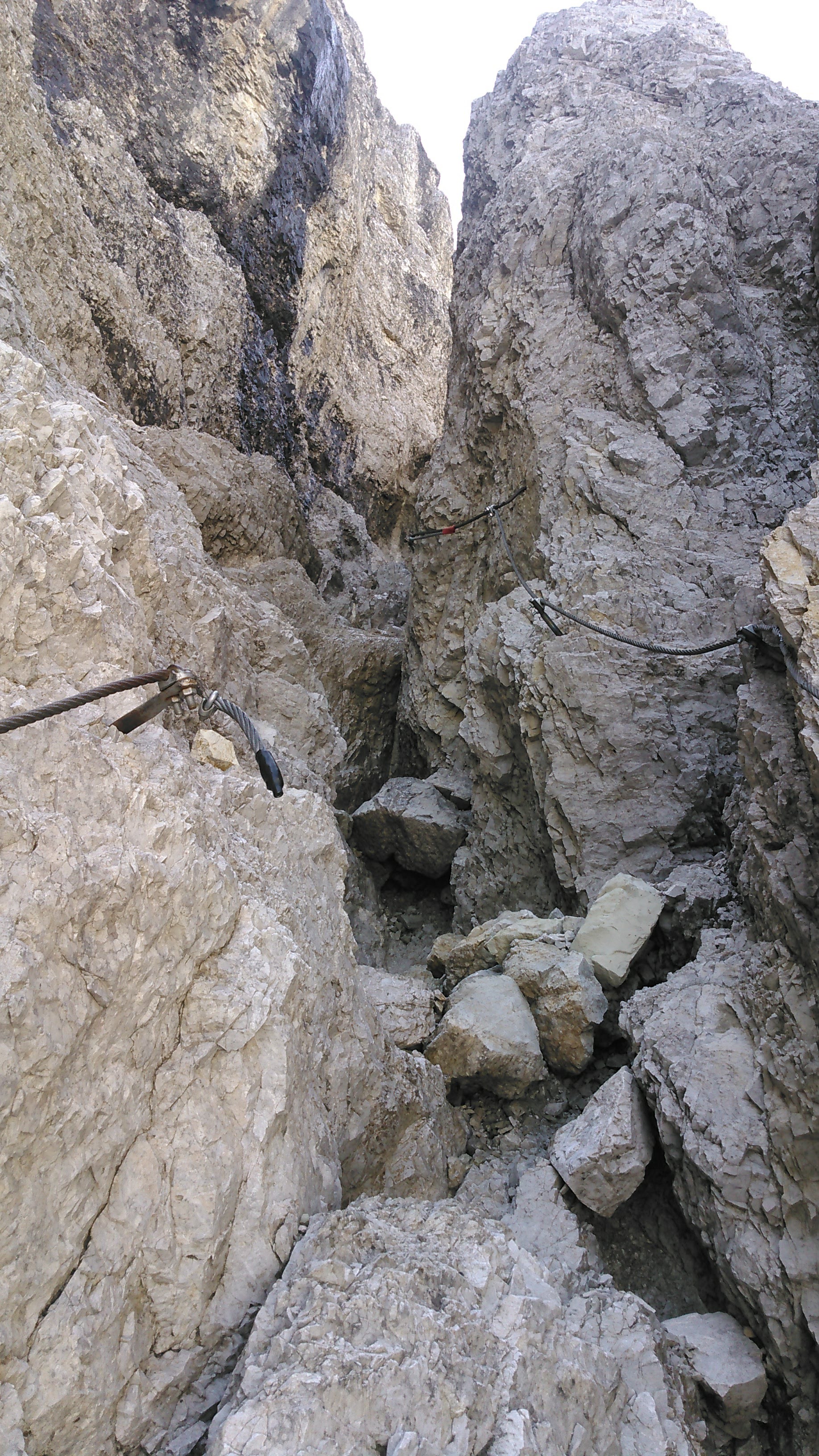 There are a few websites that have info on the Italian via ferrata, my favorite is here. Although this site has info about many many ferratas, it is by no means exhaustive. There are simply ferratas- at least short sections of ferratas- everywhere! The ferratas are rated in terms of difficulty. Different scales are used but in general rating scales use a number and a letter. The numbers are from 1 to 5 with 1 being a walking path, and 5 a rock climbing wall. The letters rank from A through C or F depending on the scale where A is the “least commitment” or exposure and C or F is the “most commitment” or exposure.