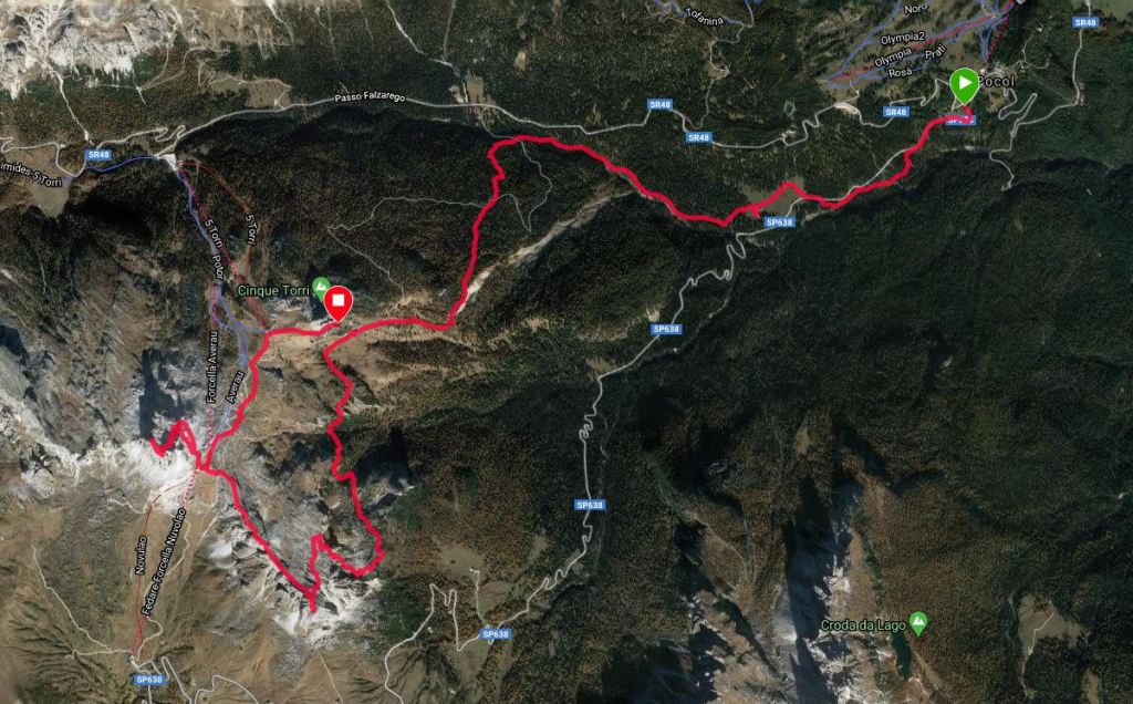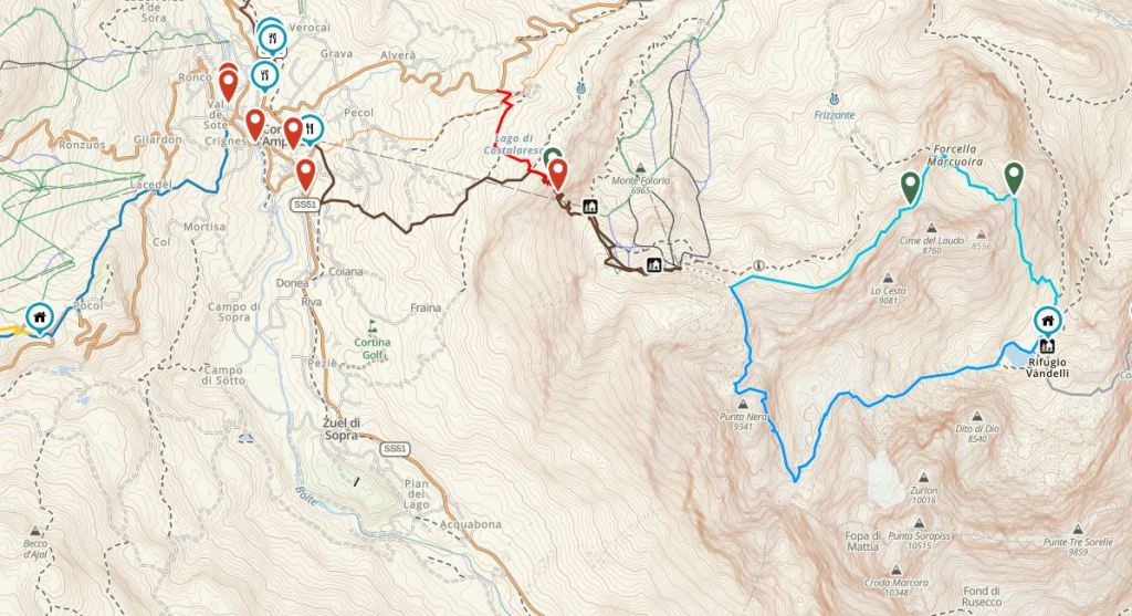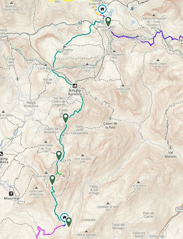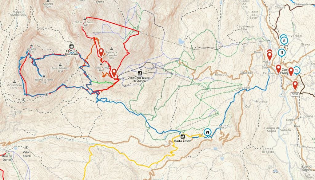 We bought and used the KOMPASS 617 map, Cortina d’Ampezzo Dolomiti Ampezzane 1:25000. In addition, we used GAIA map on our phone. This trip started on July 19, 2019 and ended on July 27, 2019.