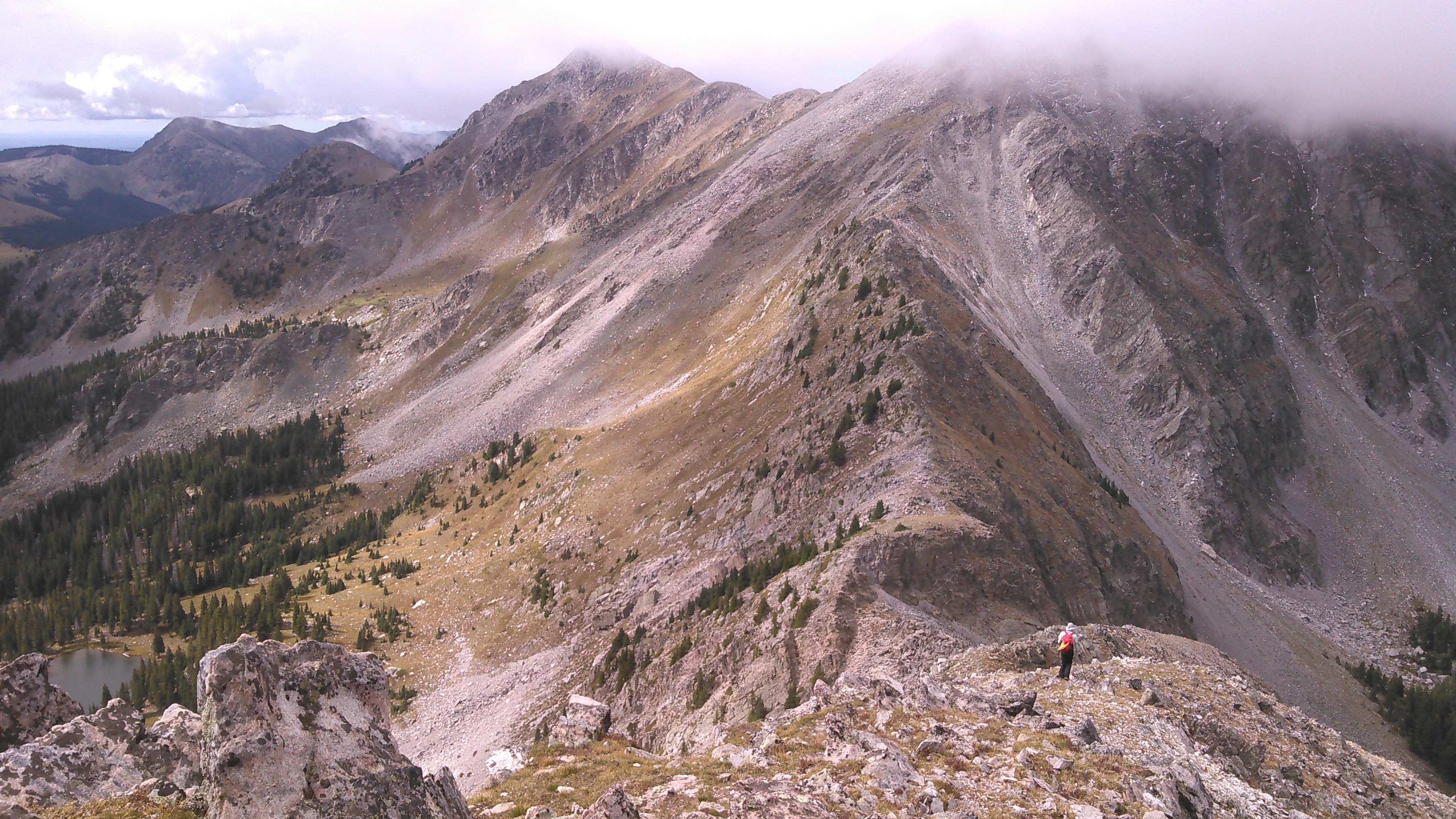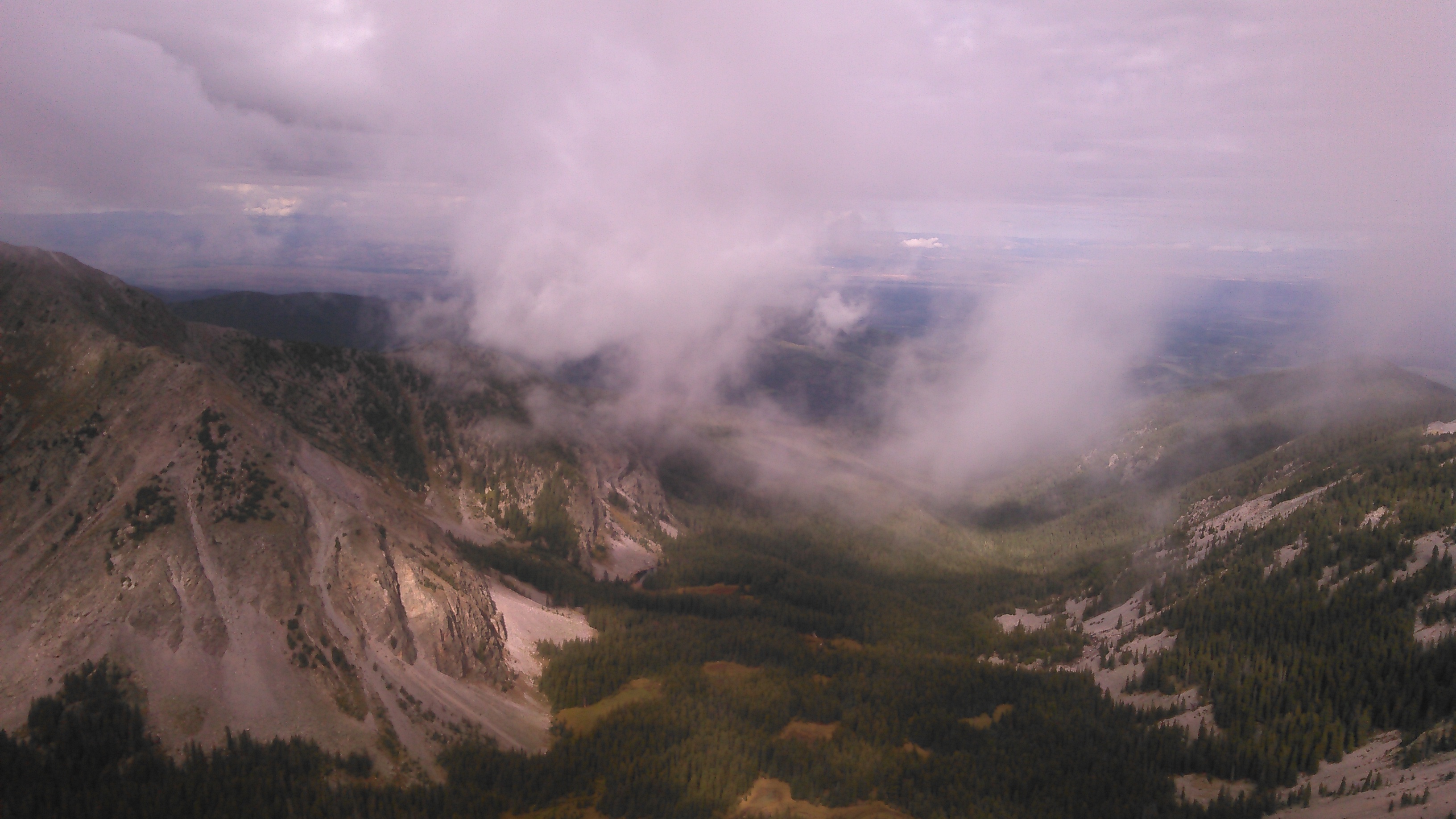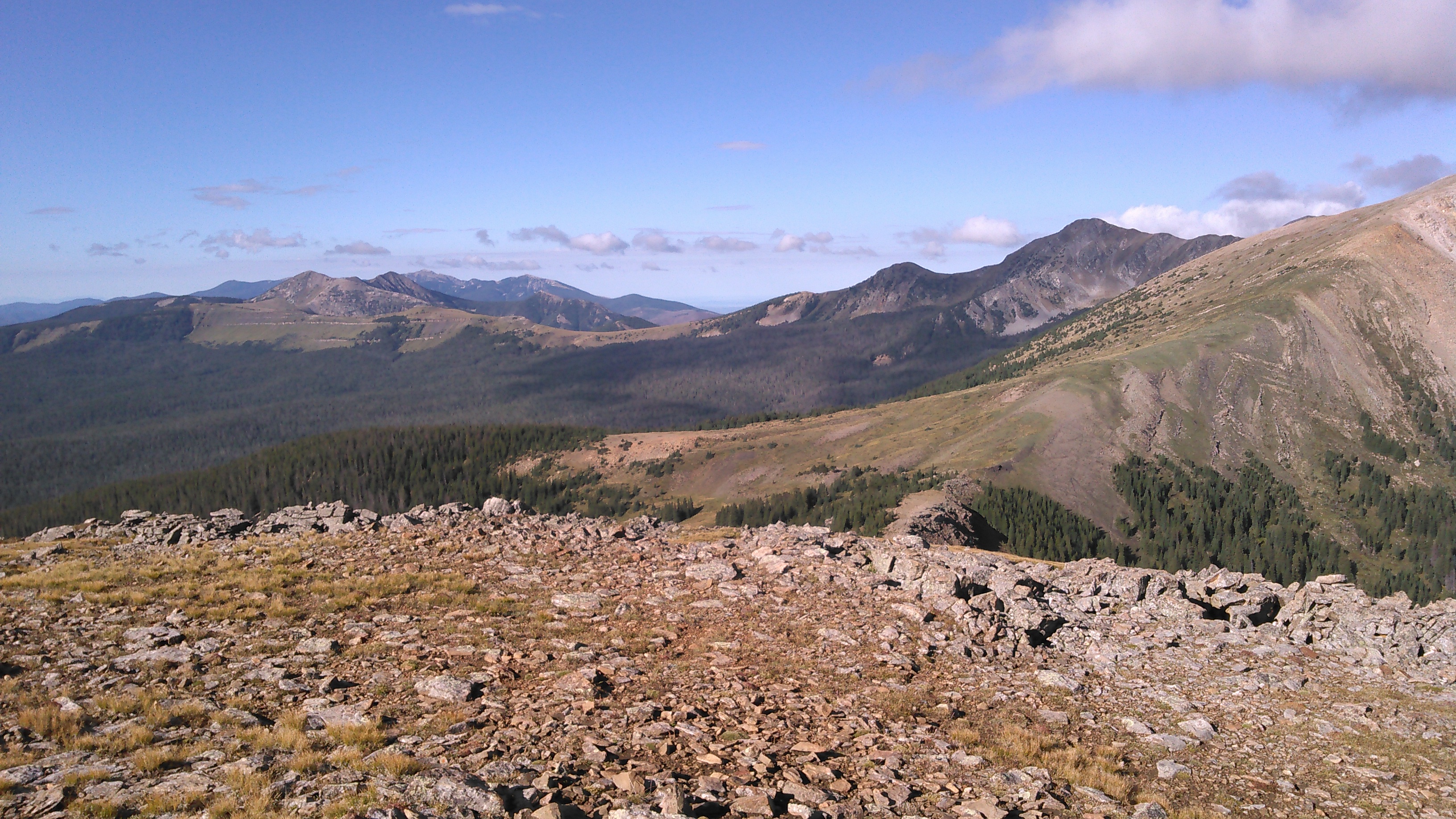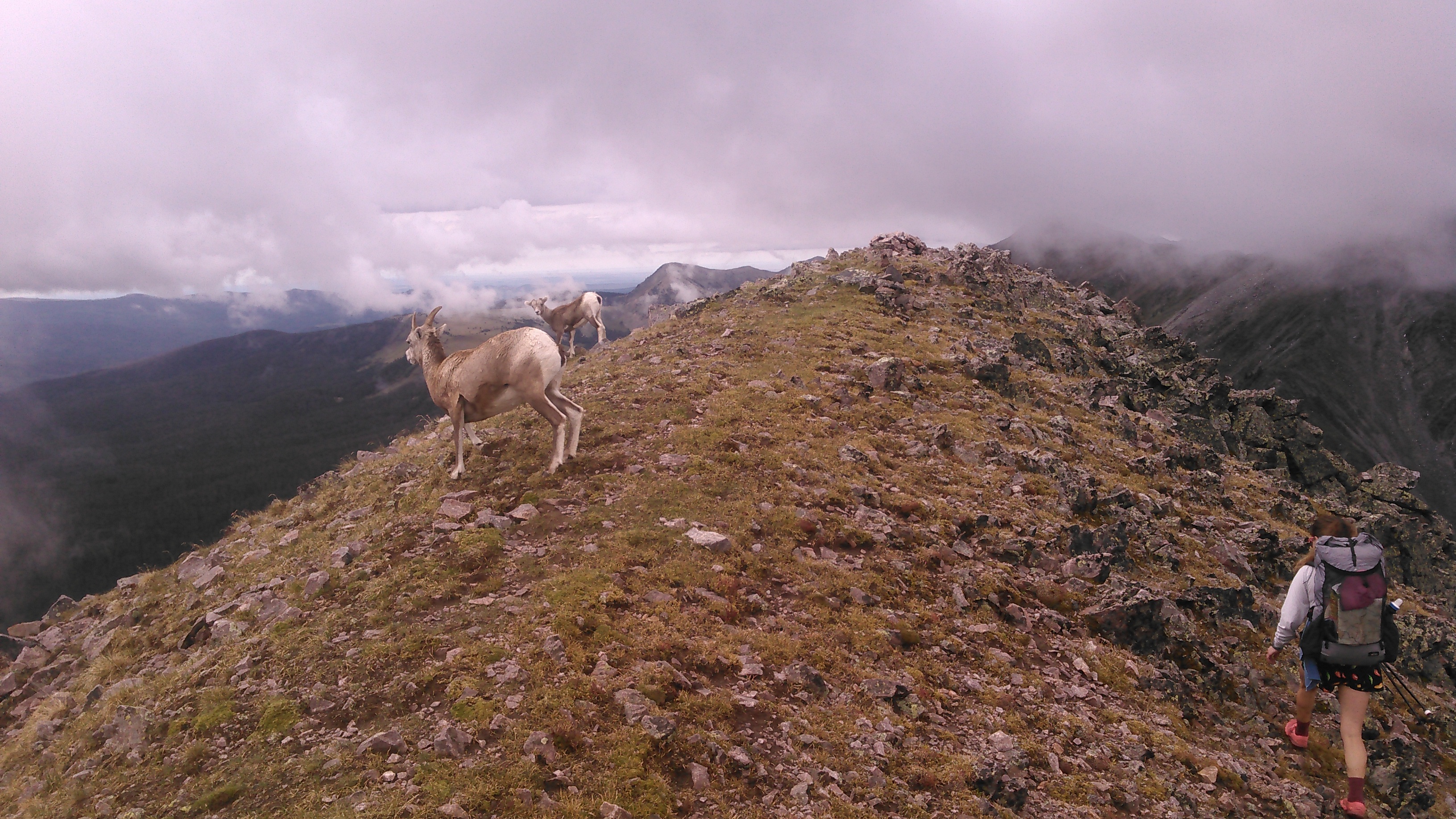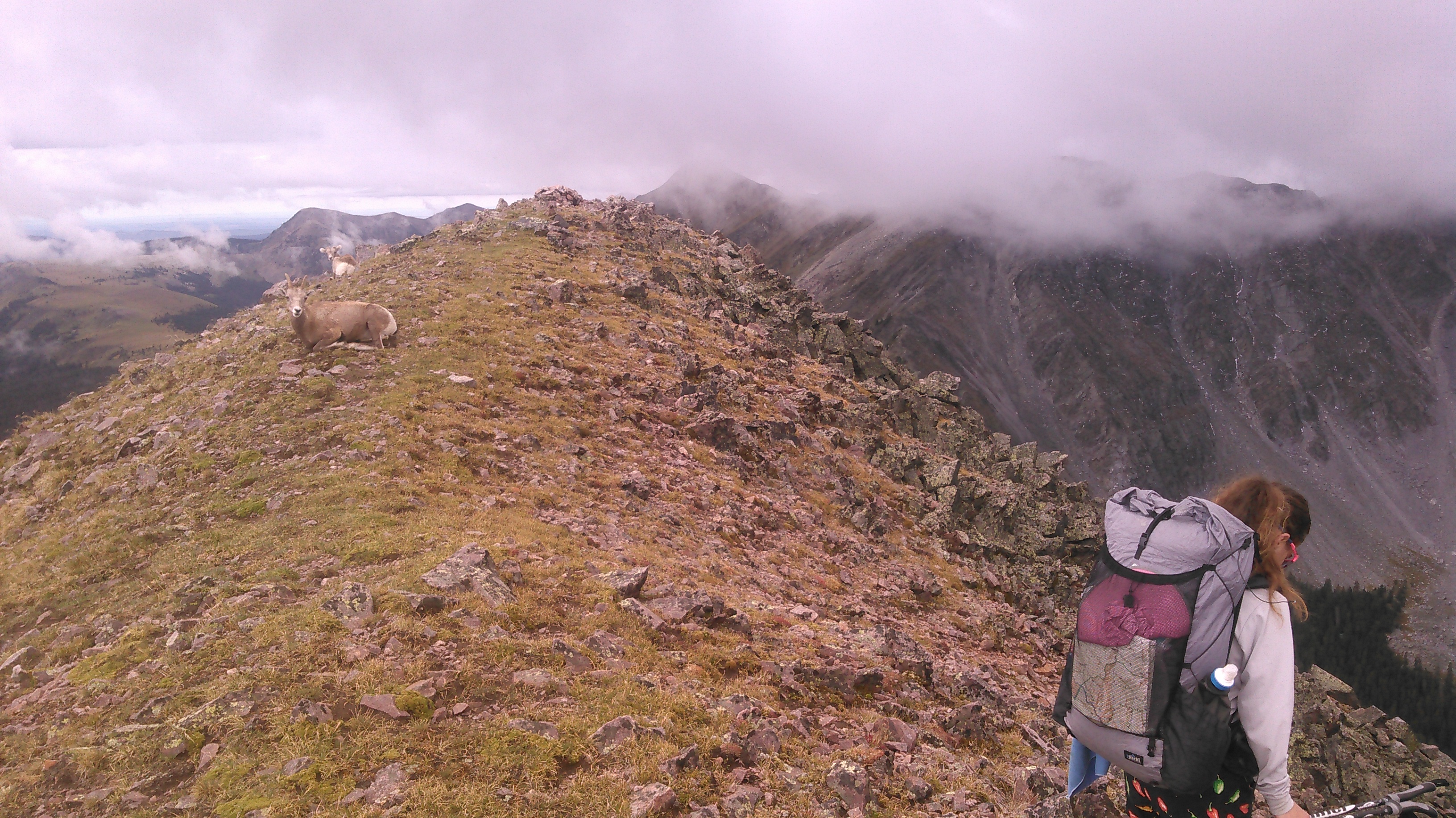Once we got to the top of the peak, we were greeted by many female bighorn sheep (without the characteristic big horns) and their babies. This was pretty cool. Given that there looked to be clouds building to the west, we didn’t dawdle too long and soon began our descent, heading along the ridge going south to the pass between Middle Truchas and North Truchas peaks.