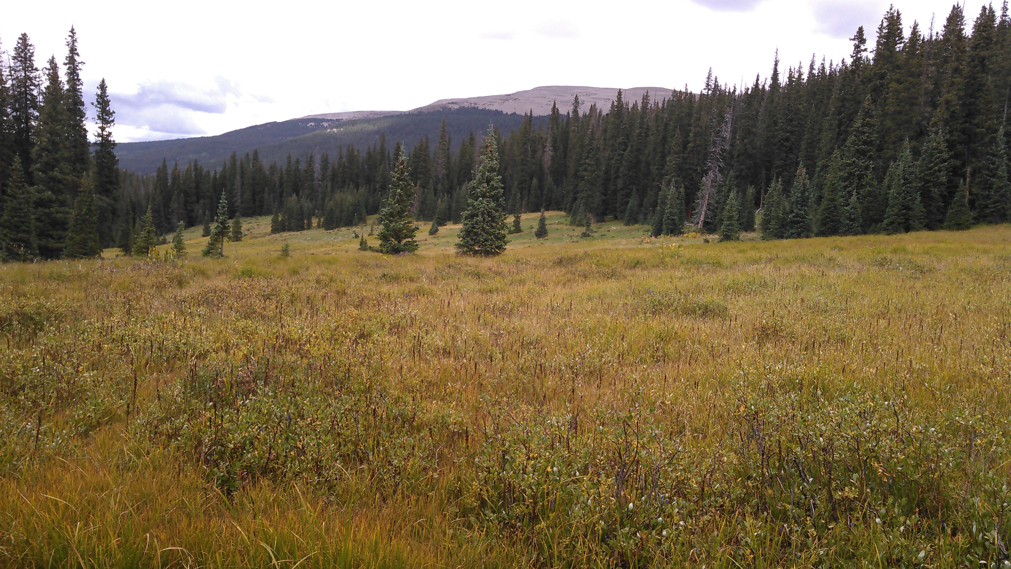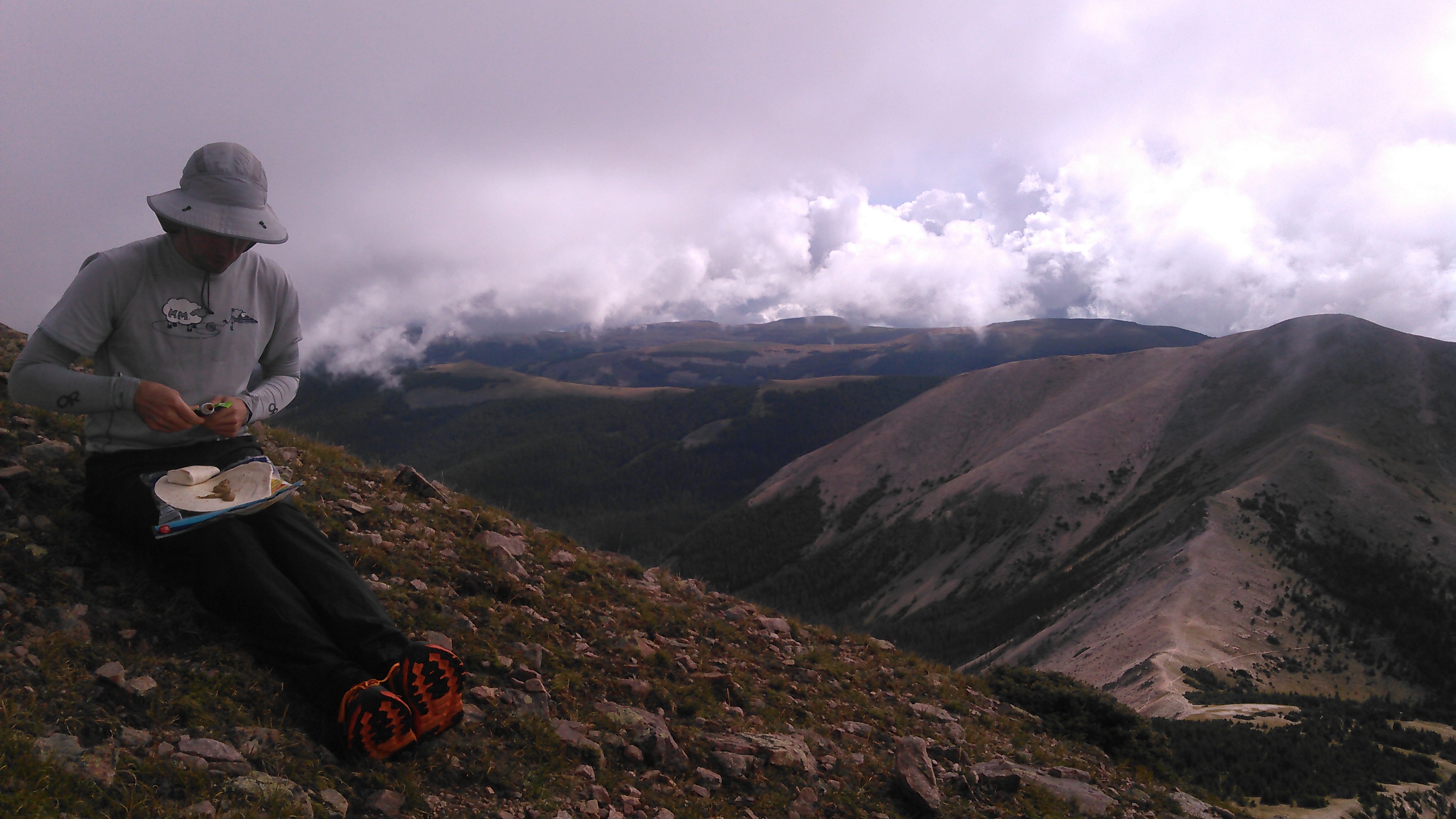 The trail completely skirted No Fish Lake. It looked like there might be some good camping in the area but we didn’t see anything obvious. There was a big switchback before we got to the pass and then we were above treeline. From the pass we could see that North Truchas Peak was a nice grassy slope to our west so we headed up. Before we were to the top we noted there were some clouds in the sky. This was quite unusual for 9 am. This didn’t stop us as we knew the route was quite short.