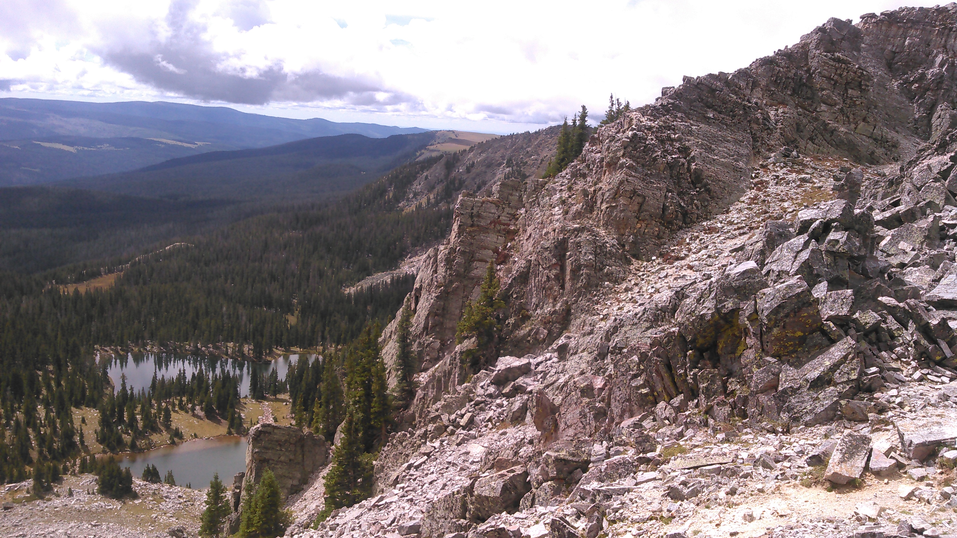 As we got near the pass, we realized we were getting mildly cliffed out. We looked to the west but this looked very steep. Just east of the pass there was a reasonable route down that involved a bit of bouldering as we downclimbed.