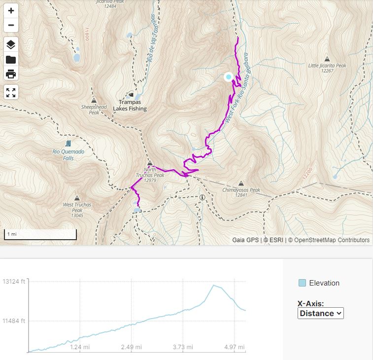 By the next morning the rain had passed through and we started out under sunny skies. While it was raining the night before, we looked at the map and made a plan that would get us off any high ridges by noon in case it stormed again. We had thought about hiking up Truchas Peak but this was a very long off-trail ridge walk that looked steep in places. Instead I suggested we just bag North Truchas Peak, a much closer and shorter off-trail hike, and then descend to the Truchas Lakes.