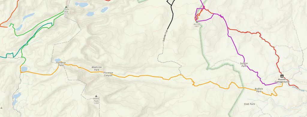 The next step was to link parts of the Solitude Trail with higher passes. Since I always like to drive the shortest distance possible, I decided to start from a trailhead on the east side of the Bighorns and chose Hunter. Front there we would hike to the Solitude Trail, picking it up on the east side where it abruptly turns north to head over Ant Hill Pass. We would head west though, clockwise up to Florence Canyon and over Florence Pass.
