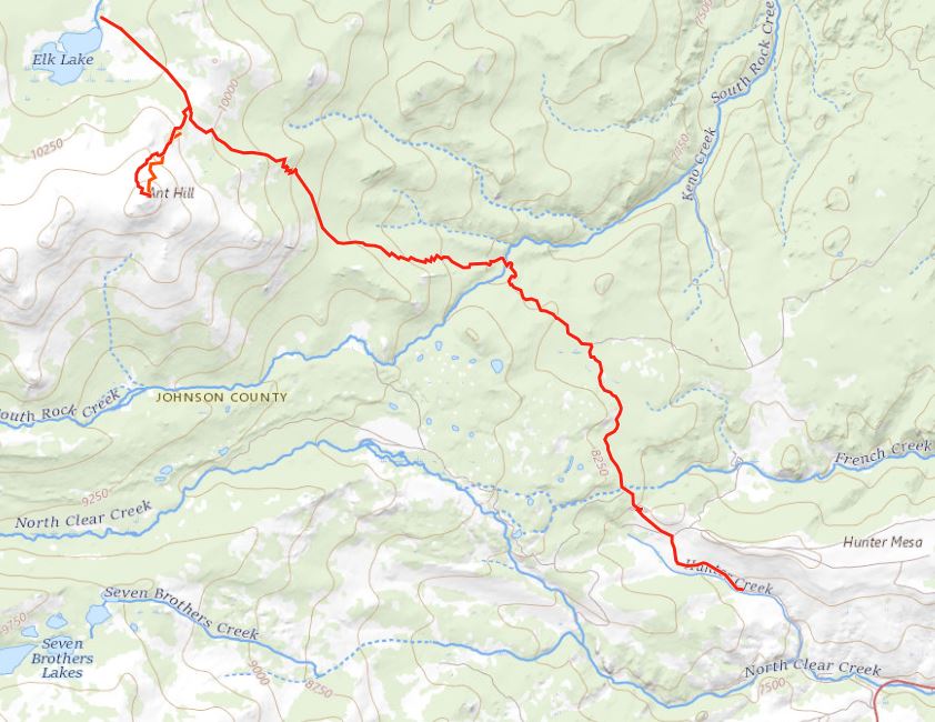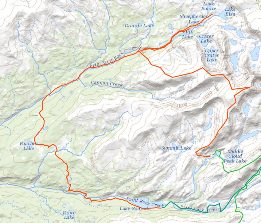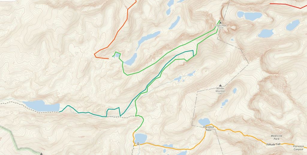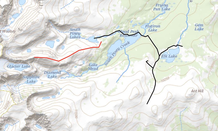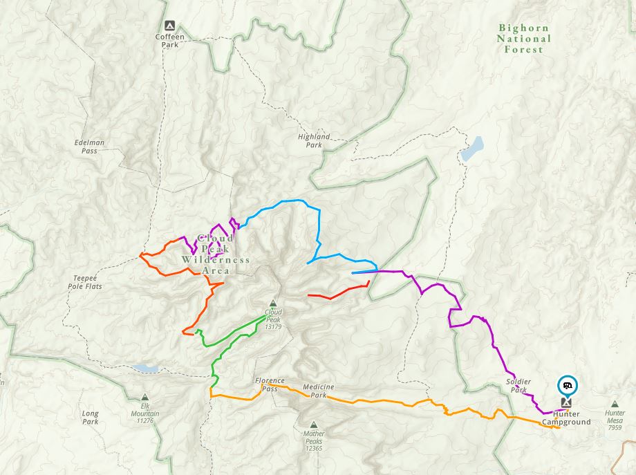 After a brief trail hike, we would again diverge from the trail, this time climbing onto the divide before hiking down to the Highland Park Lakes for our next camp. We would then do a bit of trail hiking before bushwacking and climbing up Penrose Peak, going down a different ridge, to end up at one of the lower South Piney Lakes. The next day we would hike up the adjacent ridge to the south to get a good view of the glacier off the east side of Cloud Peak, before descending one ridge over to Mead Lake for our final night out. From there we would return to the trail, briefly have one final off-trail foray up Ant Hill, before returning to Hunter Trailhead via trails.