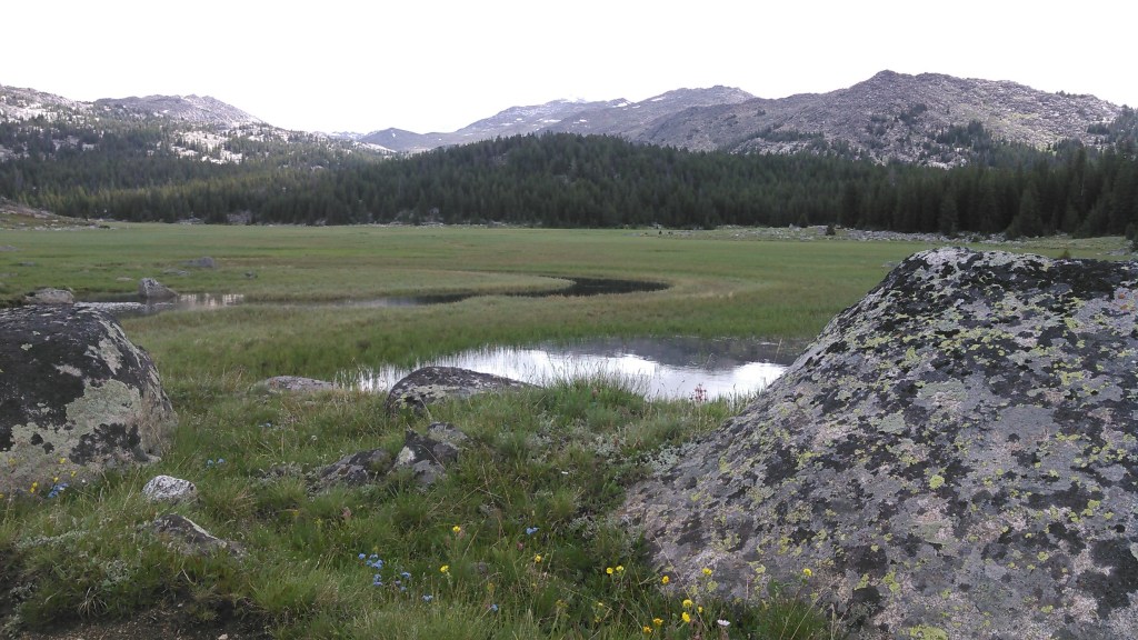 The next day we set off on the Solitude Trail under mostly cloudy skies. The Solitude Trail follows a fairly low route and as much as I wanted to go up high on the ridge, I knew that would be very tough going on boulder fields and down steep terrain. The trail was very wet on the south side of Lake Solitude as we tried to keep our feet dry. There were good views looking back towards the big waterfall draining Middle Cloud Peak Lakes and a nice field at the mouth of the lake to enjoy the view.
