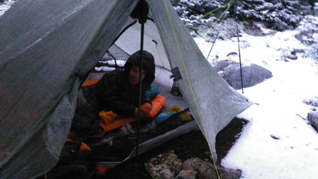 We began climbing but now, the threatening clouds that had been hanging out on the pass all morning came down to us and a sudden thunderstorm came up complete with hail. We found a spot to set up our tent and did so quickly to stay dry. It was also cold outside which can make staying warm difficult even with rain gear.