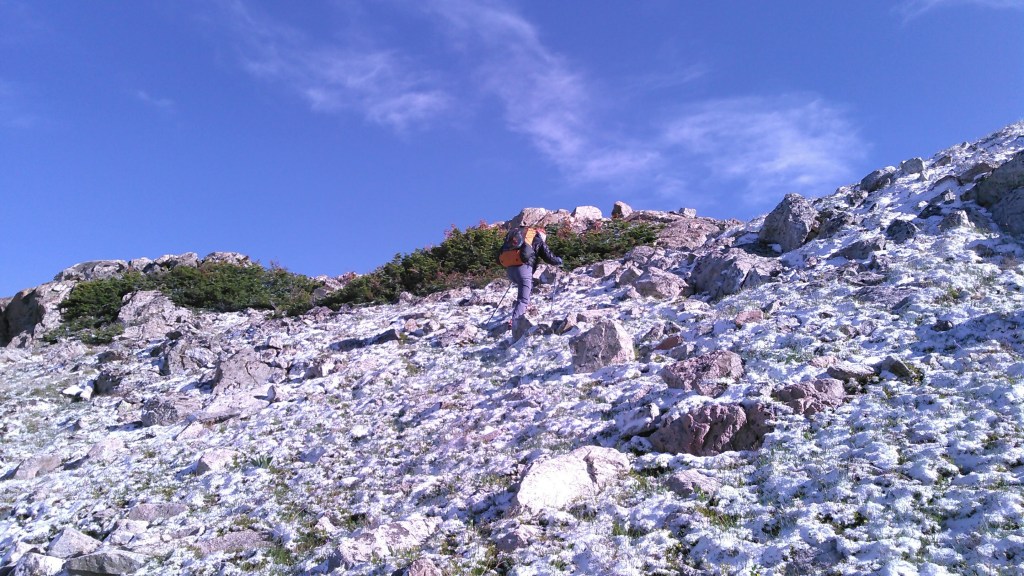 The storm rolled in and this time we got some snow! It stuck to the trees and ground. Overall it was less than an inch and made the world very pretty. It was still around in the morning when we headed up on the divide. The hike up to the divide was easy, even with the snow. There was a strong wind at our backs and we left on our down jackets. As we hiked higher and the wind kept up, we got colder and colder. We stopped behind a pile of rocks to put on our rain pants. Erik said he was tired of the snow we kicked up hitting his ankles. This briefly made me warmer. We hiked awhile on the divide heading north to where the route down wouldn’t be as steep.