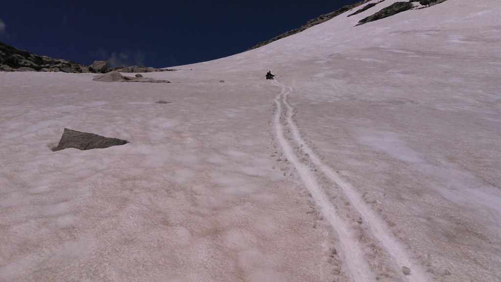 We started our descent on boulder field, trying to walk on grass or snow whenever possible. I know off-trail etiquette calls for being on hard surfaces whenever possible, but boulder fields are just too difficult. The plan was to descend a small ridge toward the Highland Park Lakes, but Erik found an adjacent snow patch perfect for glissading so we wandered over there. Erik glissaded. I did so until I fell on my butt. The snow wasn’t so steep and was soft so I could have gotten up but instead I slid on my butt for a ways.