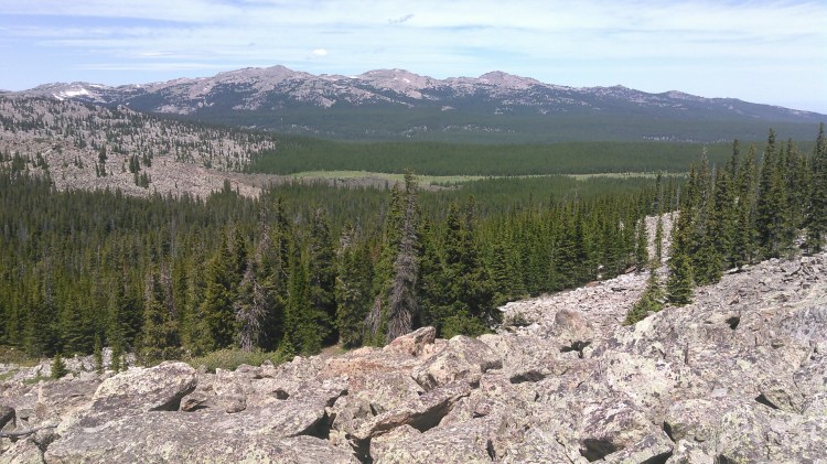 We spent the next couple of hours skirting boulder fields and finding grass as we made our way south towards South Piney Lake. An elk darted down the hill at one point. Things went well until we started heading west. Here there was no more grass. It was either boulder fields, deep forest, or the worst- a combination of both. This didn’t deter us from getting to South Piney Lake. We kept on slowly.